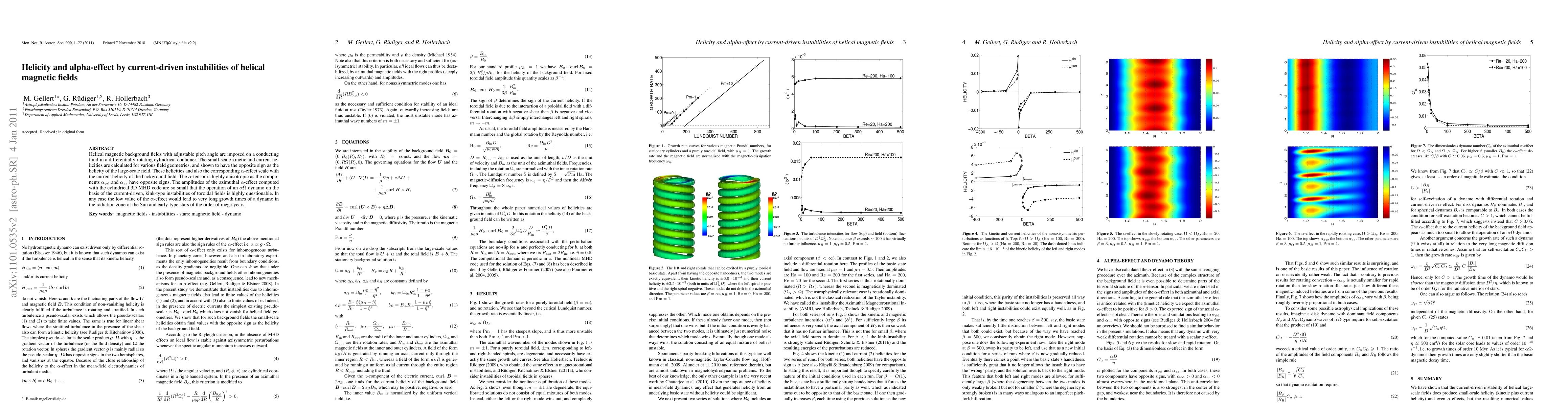 Helical magnetic background fields with adjustable pitch angle are imposed on a conducting fluid in a differentially rotating cylindrical container. The small-scale kinetic and current helicities are calculated for various field geometries, and shown to have the opposite sign as the helicity of the large-scale field. These helicities and also the corresponding $\alpha$-effect scale with the current helicity of the background field. The $\alpha$-tensor is highly anisotropic as the components $\alpha_{\phi\phi}$ and $\alpha_{zz}$ have opposite signs. The amplitudes of the azimuthal $\alpha$-effect computed with the cylindrical 3D MHD code are so small that the operation of an $\alpha\Omega$ dynamo on the basis of the current-driven, kink-type instabilities of toroidal fields is highly questionable. In any case the low value of the $\alpha$-effect would lead to very long growth times of a dynamo in the radiation zone of the Sun and early-type stars of the order of mega-years.