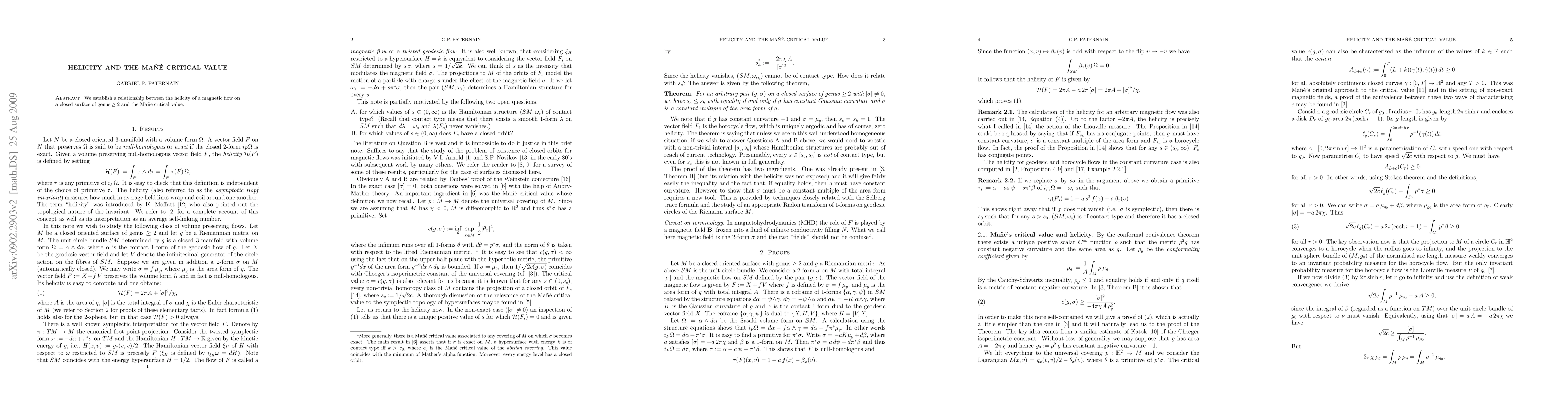 We establish a relationship between the helicity of a magnetic flow on a closed surface of genus $\geq 2$ and the Ma\~n\'e critical value.