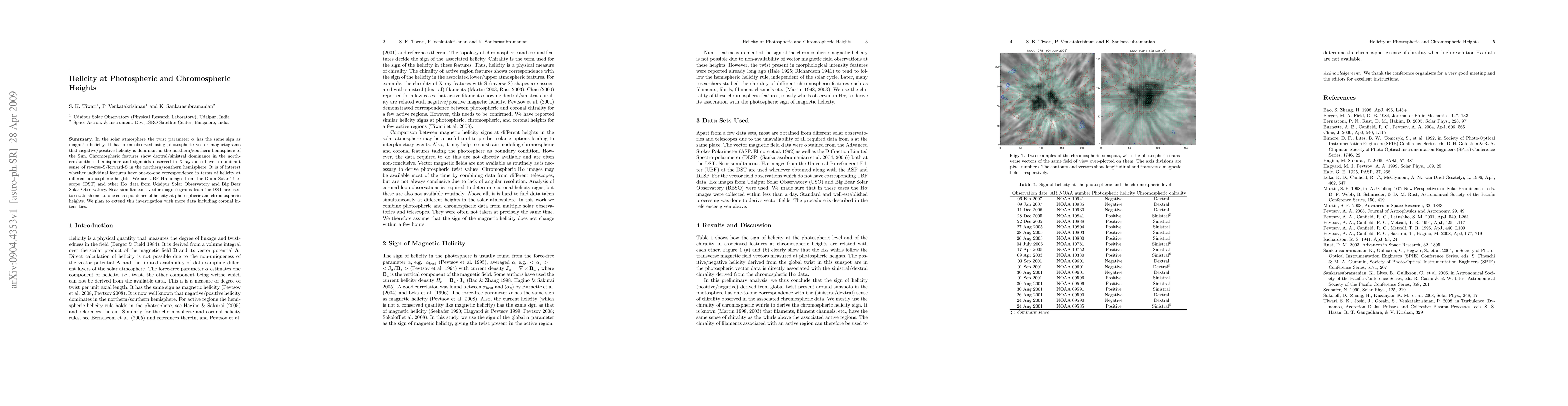 In the solar atmosphere the twist parameter $\alpha$ has the same sign as magnetic helicity. It has been observed using photospheric vector magnetograms that negative/positive helicity is dominant in the northern/southern hemisphere of the Sun. Chromospheric features show dextral/sinistral dominance in the northern/southern hemisphere and sigmoids observed in X-rays also have a dominant sense of reverse-S/forward-S in the northern/southern hemisphere. It is of interest whether individual features have one-to-one correspondence in terms of helicity at different atmospheric heights. We use UBF \Halpha images from the Dunn Solar Telescope (DST) and other \Halpha data from Udaipur Solar Observatory and Big Bear Solar Observatory. Near-simultaneous vector magnetograms from the DST are used to establish one-to-one correspondence of helicity at photospheric and chromospheric heights. We plan to extend this investigation with more data including coronal intensities.
