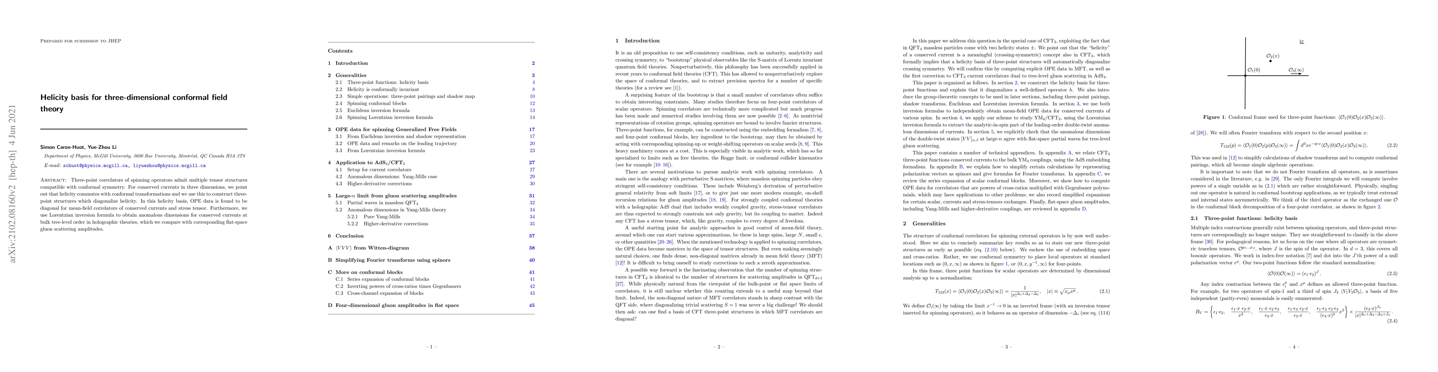 This paper constructs a helicity basis for three-dimensional conformal field theory, showing that helicity commutes with conformal transformations. It finds diagonal OPE data for mean-field correlators of conserved currents and stress tensor, and uses the Lorentzian inversion formula to determine anomalous dimensions in holographic theories, comparing them with flat-space gluon scattering amplitudes.