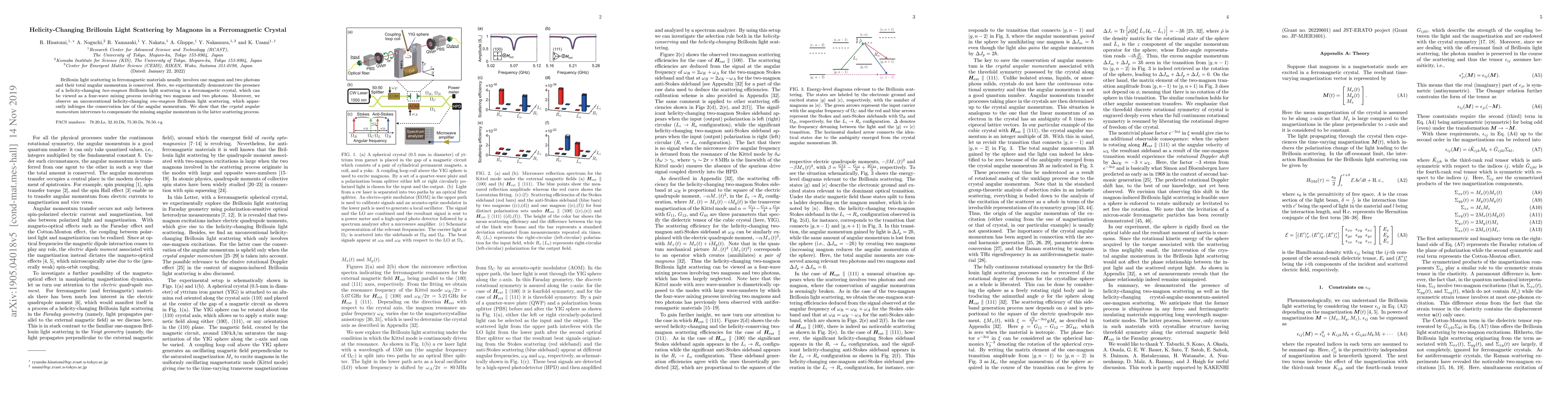 This research experimentally demonstrates helicity-changing Brillouin light scattering in ferromagnetic crystals involving two magnons and two photons, challenging the conventional angular momentum conservation. It also reveals an unconventional one-magnon process where crystal angular momentum compensates for the missing angular momentum.