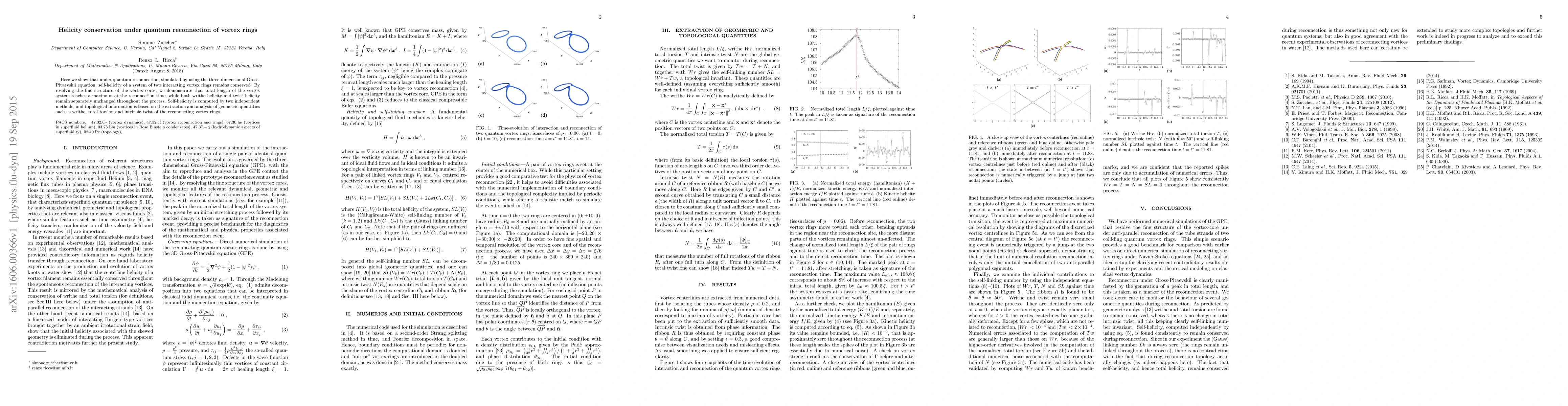 The research presents a detailed numerical analysis of vortex reconnection under the Gross-Pitaevskii equation, demonstrating helicity conservation and providing insights into the behavior of geometric and topological quantities during the process.