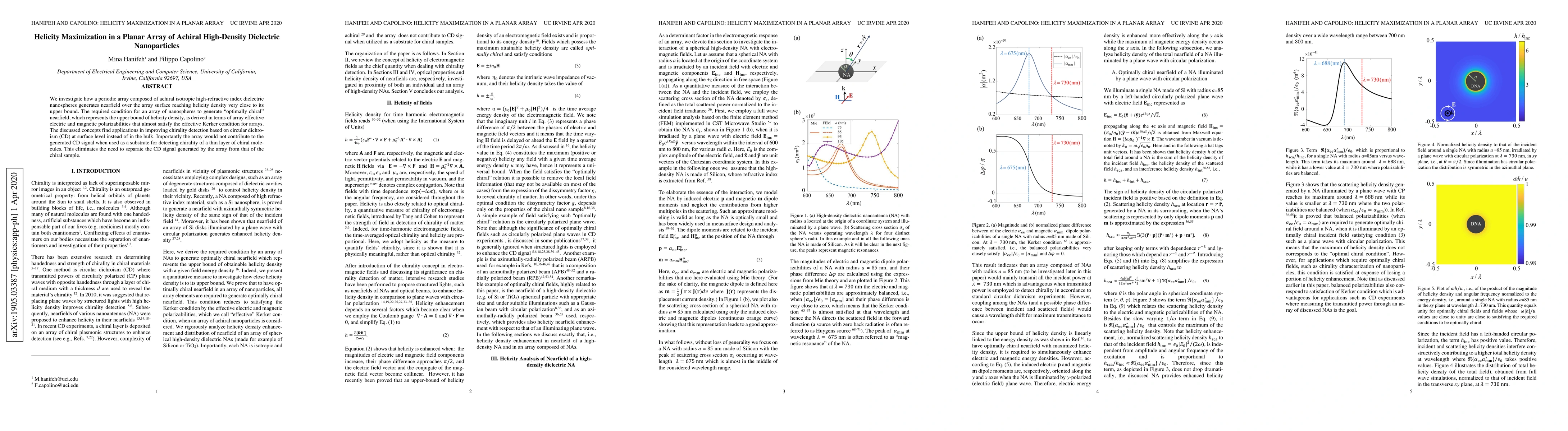 We investigate how a periodic array composed of achiral isotropic high-refractive index dielectric nanospheres generates nearfield over the array surface reaching helicity density very close to its upper bound. The required condition for an array of nanospheres to generate optimally chiral nearfield, which represents the upper bound of helicity density, is derived in terms of array effective electric and magnetic polarizabilities that almost satisfy the effective Kerker condition for arrays. The discussed concepts find applications in improving chirality detection based on circular dichroism (CD) at surface level instead of in the bulk. Importantly the array would not contribute to the generated CD signal when used as a substrate for detecting chirality of a thin layer of chiral molecules. This eliminates the need to separate the CD signal generated by the array from that of the chiral sample.