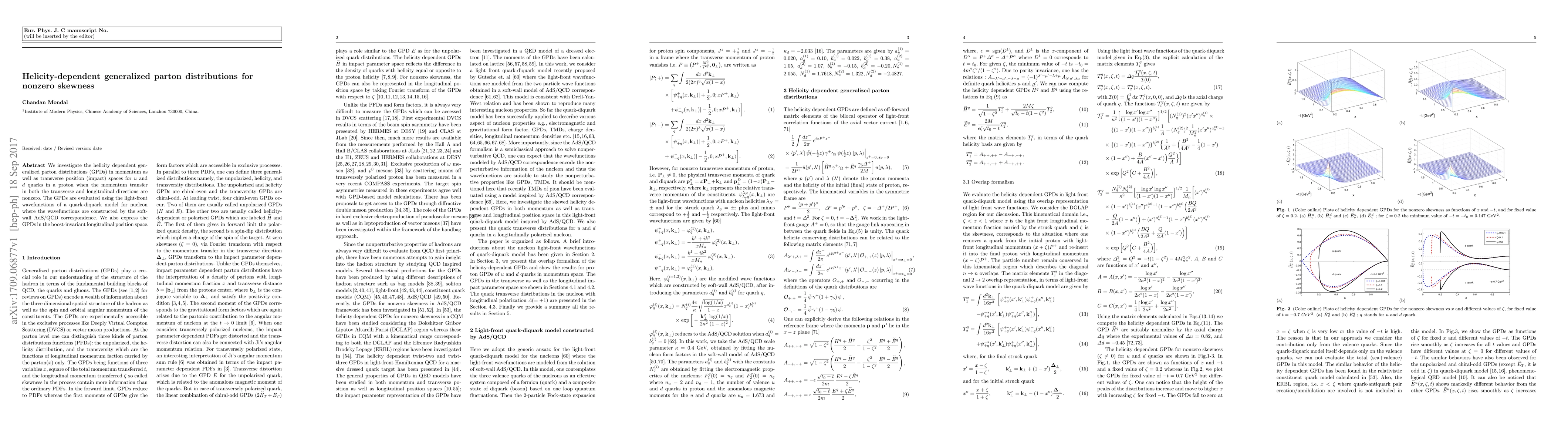 Researchers investigated helicity-dependent generalized parton distributions for protons with nonzero skewness in momentum and transverse position spaces using a quark-diquark model and the soft-wall AdS/QCD correspondence.