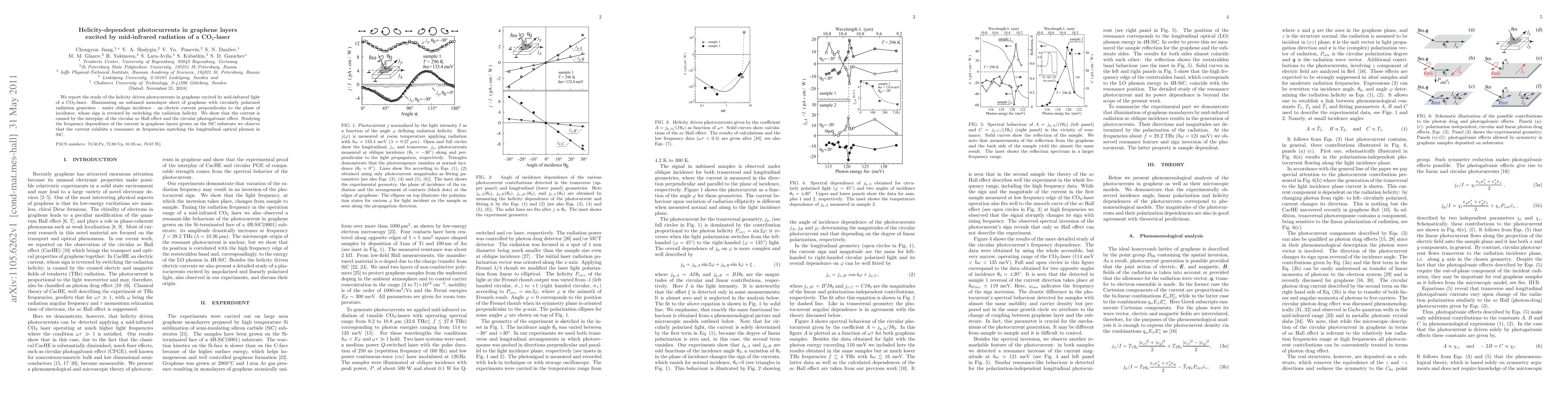 This study investigates the generation of helicity-dependent photocurrents in graphene layers under mid-infrared CO$_2$-laser illumination, revealing a current reversal with helicity change due to the combined circular $ac$ Hall effect and circular photogalvanic effect. The observed resonance at frequencies matching the longitudinal optical phonon in SiC substrate indicates significant substrate influence.