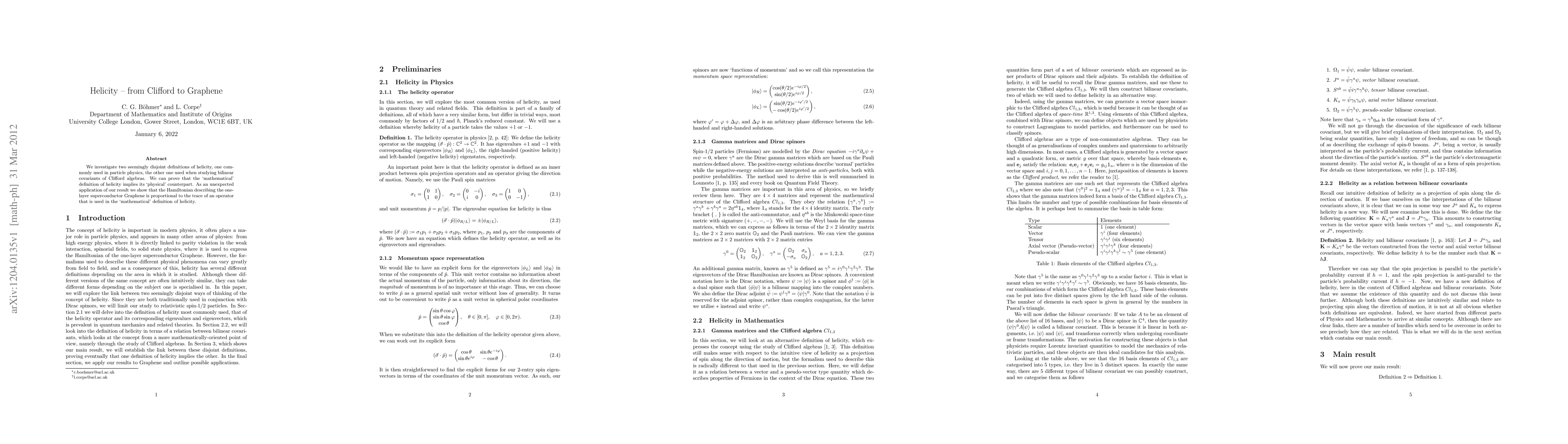 We investigate two seemingly disjoint definitions of helicity, one commonly used in particle physics, the other one used when studying bilinear covariants of Clifford algebras. We can prove that the `mathematical' definition of helicity implies its `physical' counterpart. As an unexpected application of our result we show that the Hamiltonian describing the one-layer superconductor Graphene is proportional to the trace of an operator that is used in the `mathematical' definition of helicity.