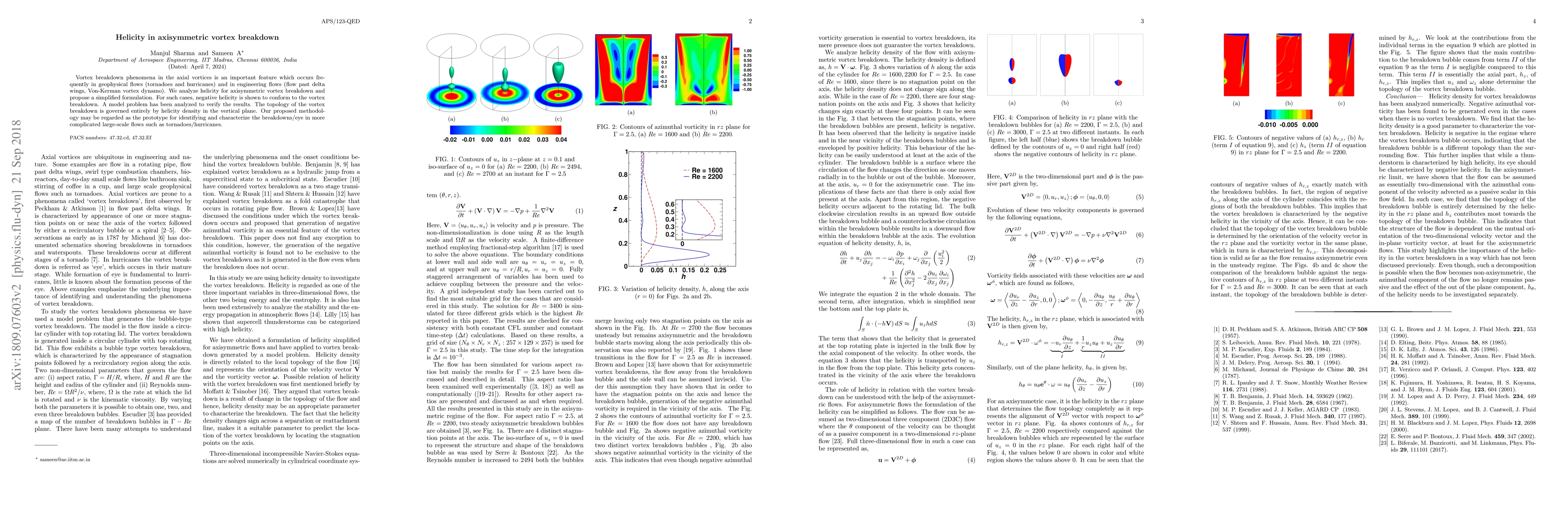 Researchers analyze helicity in axisymmetric vortex breakdown, proposing a simplified formulation that explains the negative helicity conforming to vortex breakdown, which can help identify characteristic features of tornadoes and hurricanes.