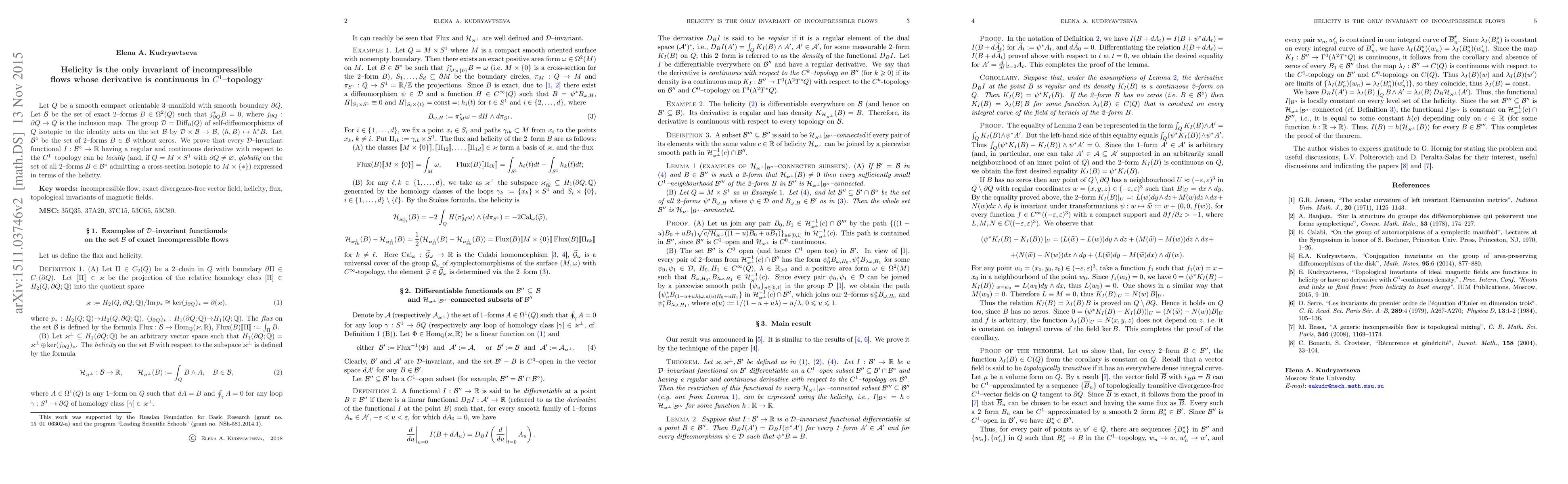 Let $Q$ be a smooth compact orientable 3--manifold with smooth boundary $\partial Q$. Let $\mathcal{B}$ be the set of exact 2--forms $B\in\Omega^2(Q)$ such that $j_{\partial Q}^*B=0$, where $j_{\partial Q}:{\partial Q}\to Q$ is the inclusion map. The group $\mathcal{D}=\mathrm{Diff}_0(Q)$ of self-diffeomorphisms of $Q$ isotopic to the identity acts on the set $\mathcal{B}$ by $\mathcal{D}\times\mathcal{B}\to\mathcal{B}$, $(h,B)\mapsto h^*B$. Let $\mathcal{B}^\circ$ be the set of 2--forms $B\in\mathcal{B}$ without zeros. We prove that every $\mathcal{D}$--invariant functional $I:\mathcal{B}^\circ\to\mathbb{R}$ having a regular and continuous derivative with respect to the $C^1$--topology can be locally (and, if $Q=M\times S^1$ with $\partial Q\ne\varnothing$, globally on the set of all 2--forms $B\in\mathcal{B}^\circ$ admitting a cross-section isotopic to $M\times\{*\}$) expressed in terms of the helicity.