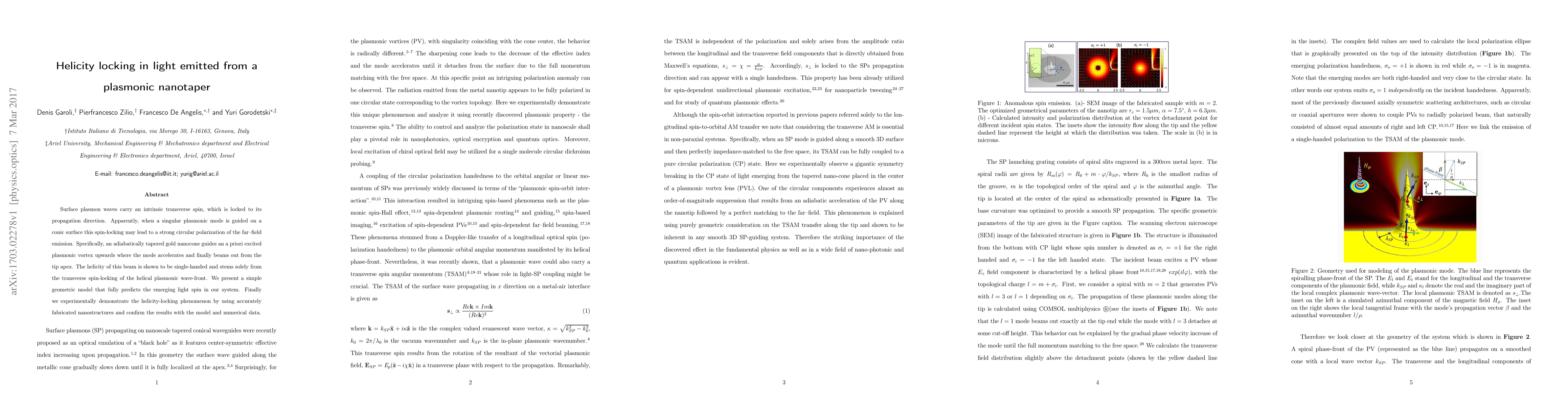 This paper investigates the phenomenon of helicity locking in light emitted from a plasmonic nanotaper, demonstrating that the transverse spin of surface plasmon waves can lead to strong circular polarization. The study uses an adiabatically tapered gold nanocone to guide a plasmonic vortex, resulting in a single-handed helicity beam from the tip, which is predicted by a simple geometric model and confirmed experimentally.