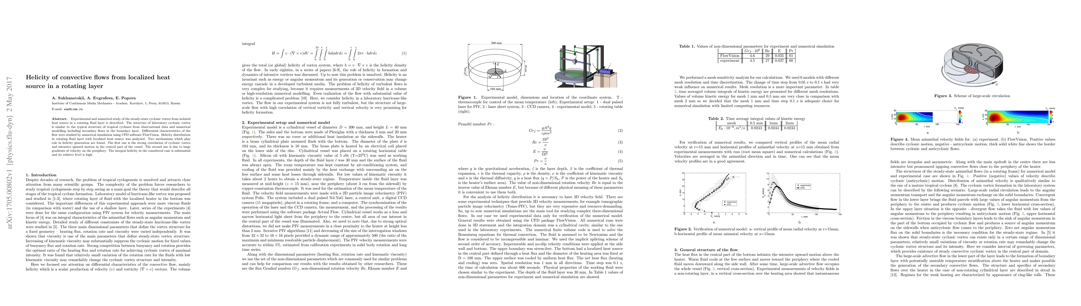 This study investigates the cyclonic vortex formed from a localized heat source in a rotating fluid layer, comparing experimental and numerical results. The research identifies two mechanisms for helicity generation: strong correlation between the cyclonic vortex and central upward motion, and large velocity gradients on the periphery.
