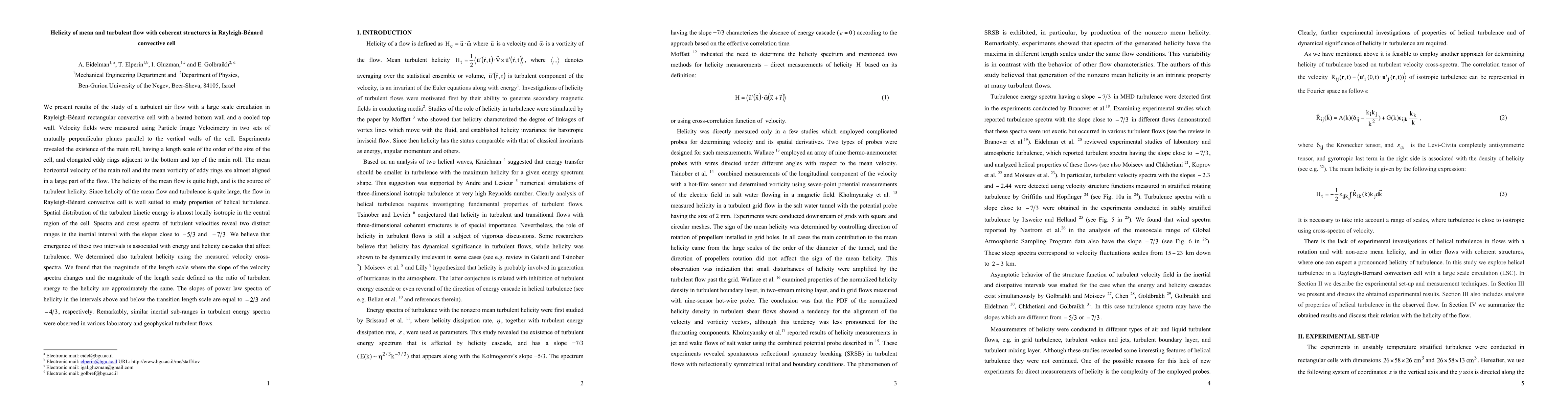 This study investigates the helicity of mean and turbulent flow in a Rayleigh-Benard convective cell, revealing high helicity in the mean flow that aligns with the main roll and eddy rings, serving as a source for turbulent helicity. The large-scale helical structures make this flow ideal for studying helical turbulence properties.