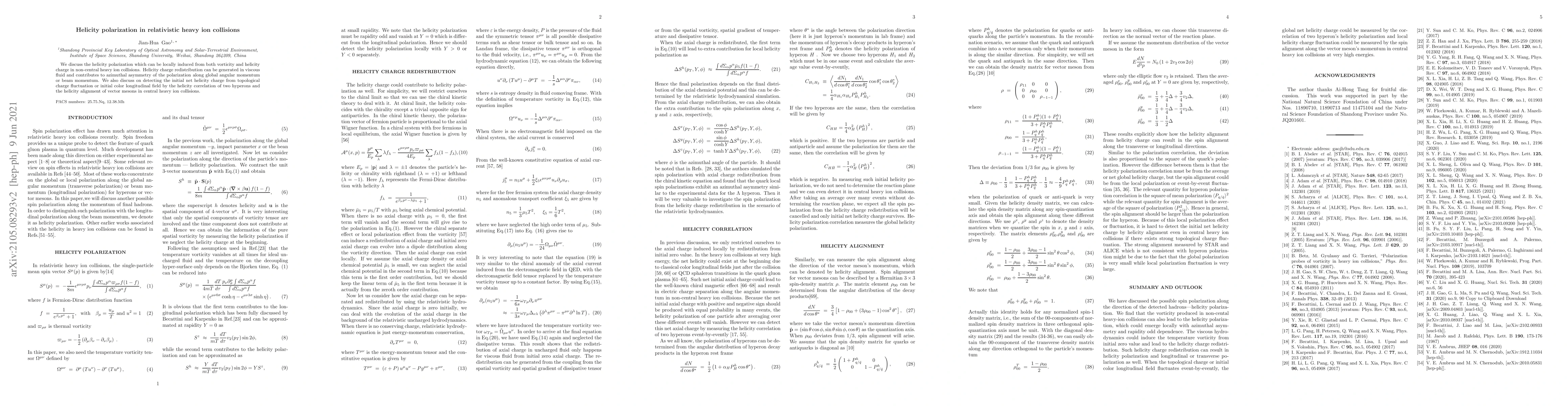 We discuss the helicity polarization which can be locally induced from both vorticity and helicity charge in non-central heavy ion collisions. Helicity charge redistribution can be generated in viscous fluid and contributes to azimuthal asymmetry of the polarization along global angular momentum or beam momentum. We also discuss on detecting the initial net helicity charge from topological charge fluctuation or initial color longitudinal field by the helicity polarization correlation of two hyperons and the helicity alignment of vector mesons in central heavy ion collisions.