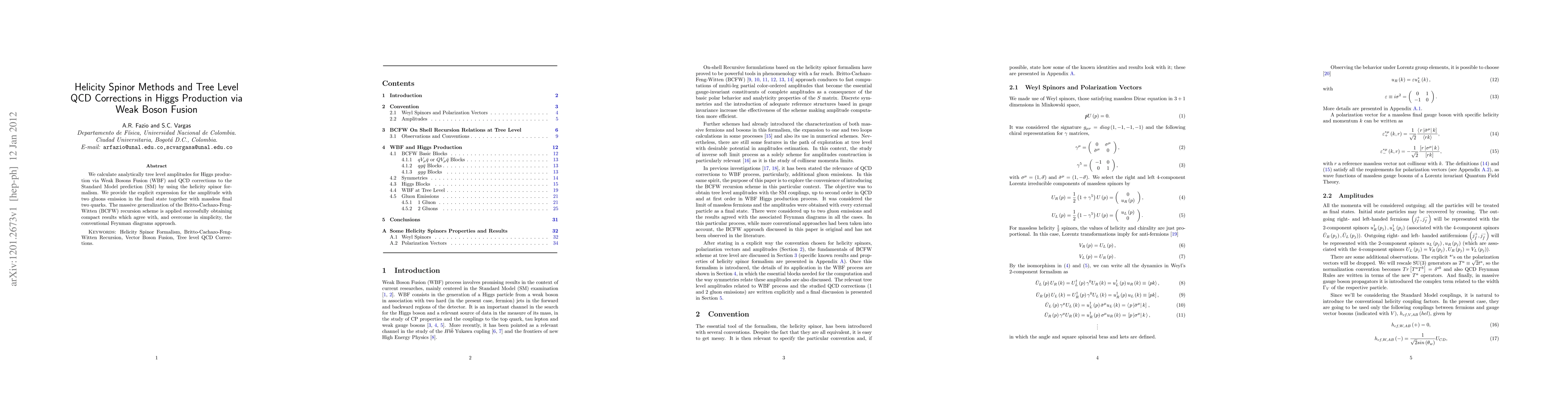 We calculate analytically tree level amplitudes for Higgs production via Weak Bosons Fusion (WBF) and QCD corrections to the Standard Model prediction (SM) by using the helicity spinor formalism. We provide the explicit expression for the amplitude with two gluons emission in the final state together with massless final two quarks. The massive generalization of the Britto-Cachazo-Feng-Witten (BCFW) recursion scheme is applied successfully obtaining compact results which agree with, and overcome in simplicity, the conventional Feynman diagrams approach.