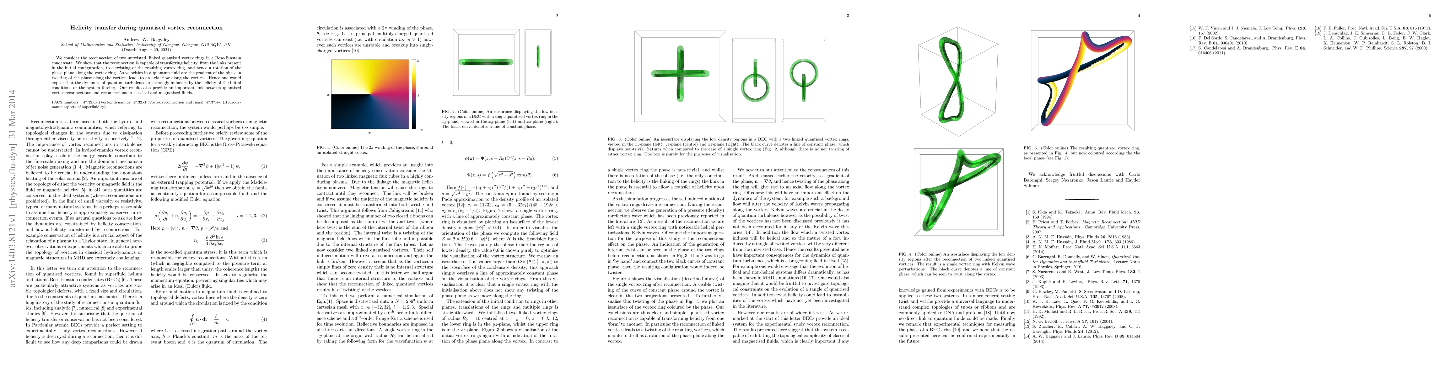 This study demonstrates that quantised vortex reconnection in Bose-Einstein condensates can transfer helicity from the initial linked vortex configuration to a twisting of the resulting vortex ring, influencing the phase plane rotation and axial flow. This process highlights the significant impact of initial helicity on quantum turbulence dynamics and parallels reconnections in classical and magnetised fluids.