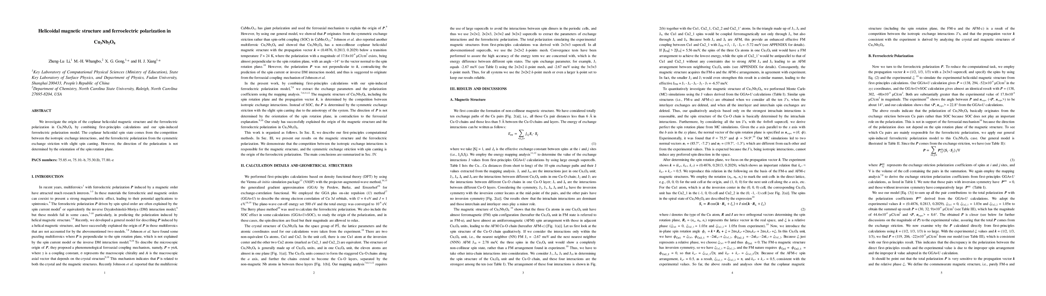 This research uses first-principles calculations and a spin-induced ferroelectric polarization model to explain the coplanar helicoidal magnetic structure and ferroelectric polarization in Cu3Nb2O8. The findings reveal that the magnetic structure arises from isotropic exchange interactions, while the ferroelectric polarization results from symmetric exchange striction with slight spin canting. The polarization direction isn't determined by the spin rotation plane's orientation.