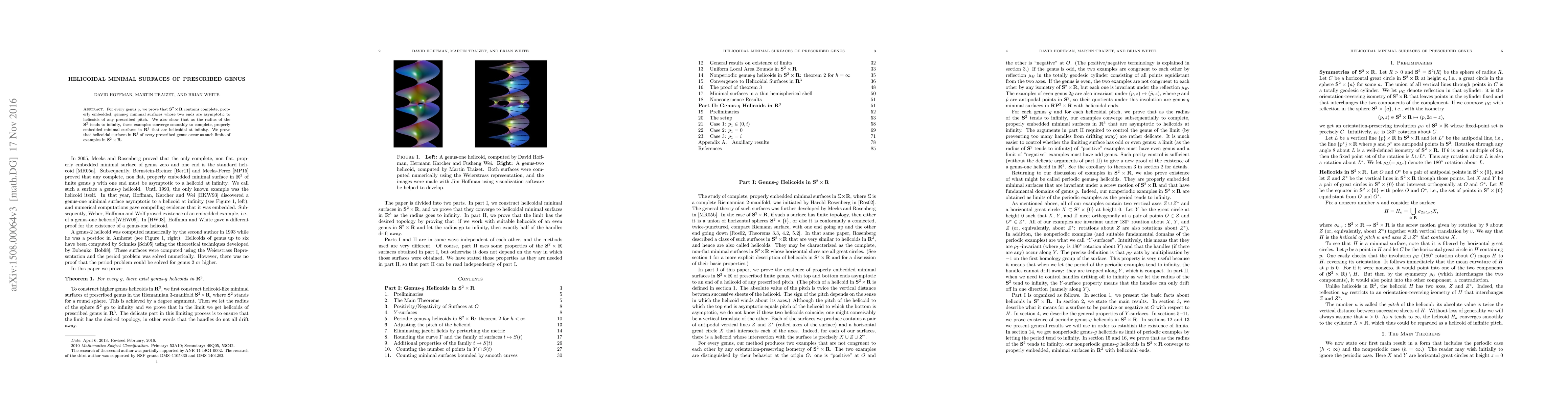 For every genus $g$, we prove that $S^2 \times R$ contains complete, properly embedded, genus-$g$ minimal surfaces whose two ends are asymptotic to helicoids of any prescribed pitch. We also show that as the radius of the $S^2$ tends to infinity, these examples converge smoothly to complete, properly embedded minimal surfaces in $R^3$ that are helicoidal at infinity. We prove that helicoidal surfaces in $R^3$ of every prescribed genus occur as such limits of examples in $S^2\times R$.