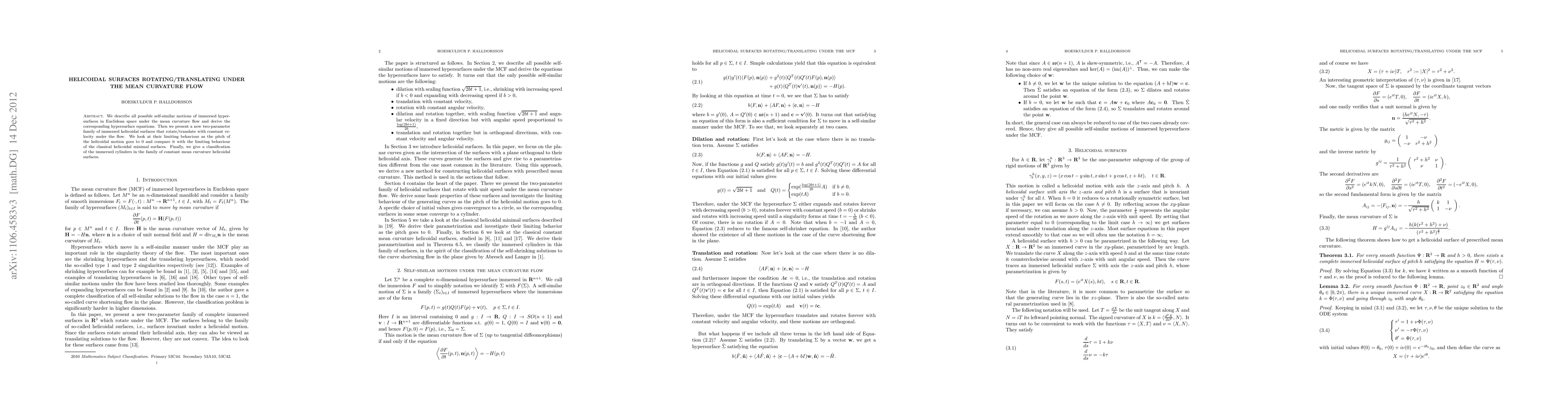This paper explores self-similar motions of immersed hypersurfaces under mean curvature flow, deriving corresponding equations, and introduces a new two-parameter family of helicoidal surfaces that rotate/translate with constant velocity. It also classifies immersed cylinders within this family of constant mean curvature helicoidal surfaces.
