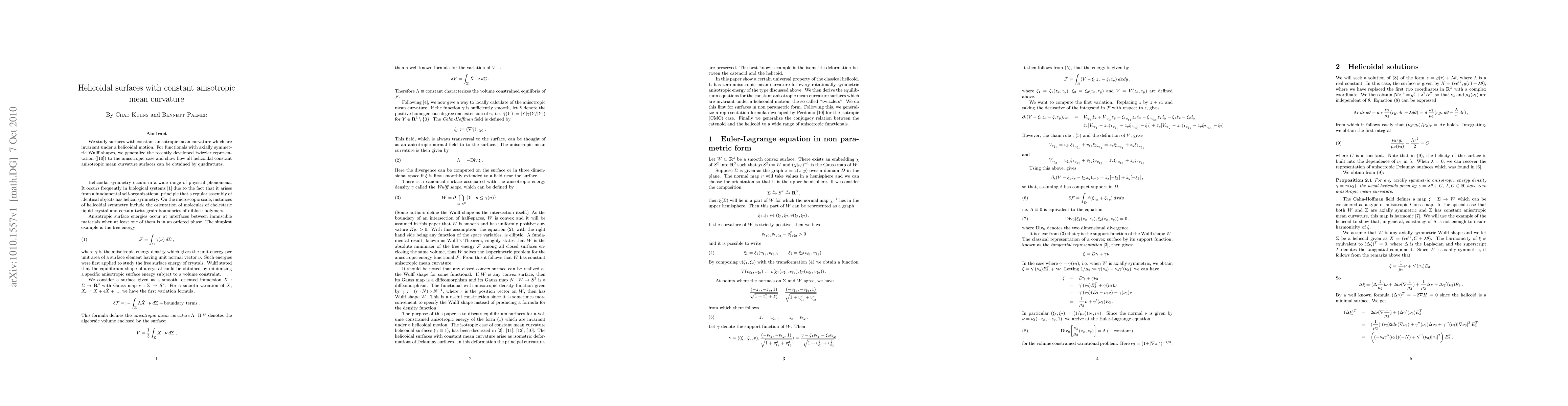 This paper investigates helicoidal surfaces with constant anisotropic mean curvature, demonstrating a generalized twizzler representation for axially symmetric Wulff shapes. It shows that all such surfaces can be derived through quadratures.