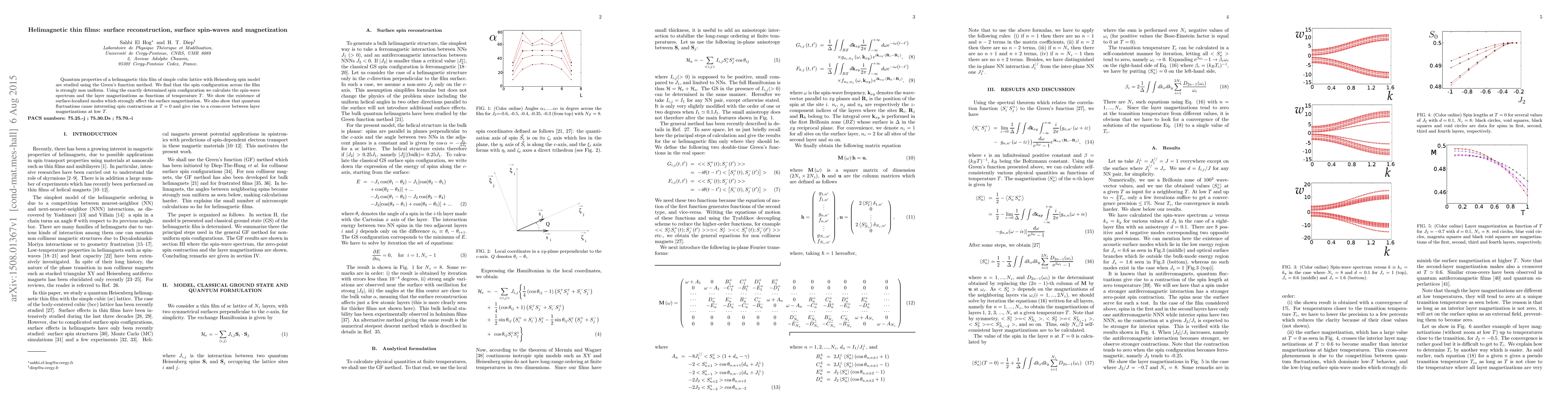A study on helimagnetic thin films reveals non-uniform spin configurations and surface-localized modes that affect magnetization, with quantum fluctuations leading to interesting spin contractions at low temperatures.