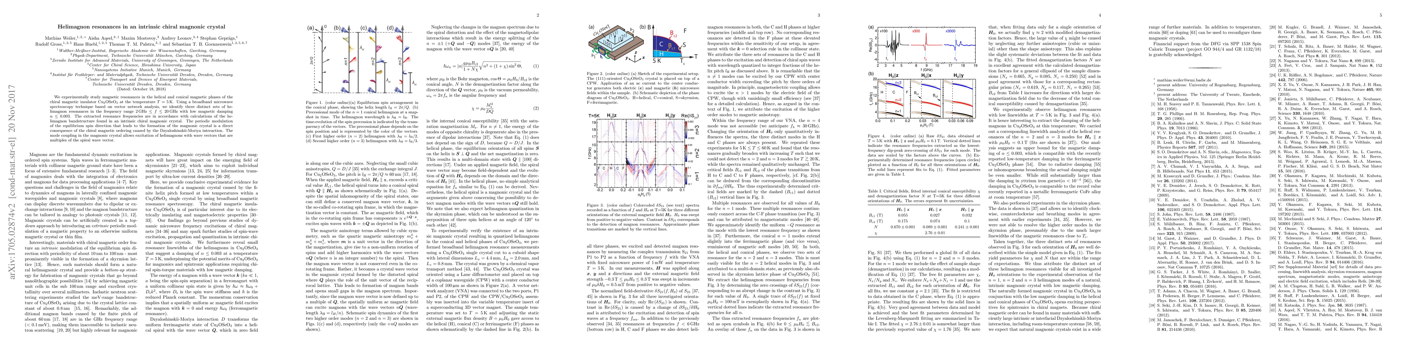 This paper investigates magnetic resonances in the chiral magnetic insulator Cu$_2$OSeO$_3$ using microwave spectroscopy, identifying three sets of helimagnon resonances. The results align with theoretical predictions of helimagnon bandstructures in chiral magnonic crystals, highlighting the influence of the Dzyaloshinskii-Moriya interaction.