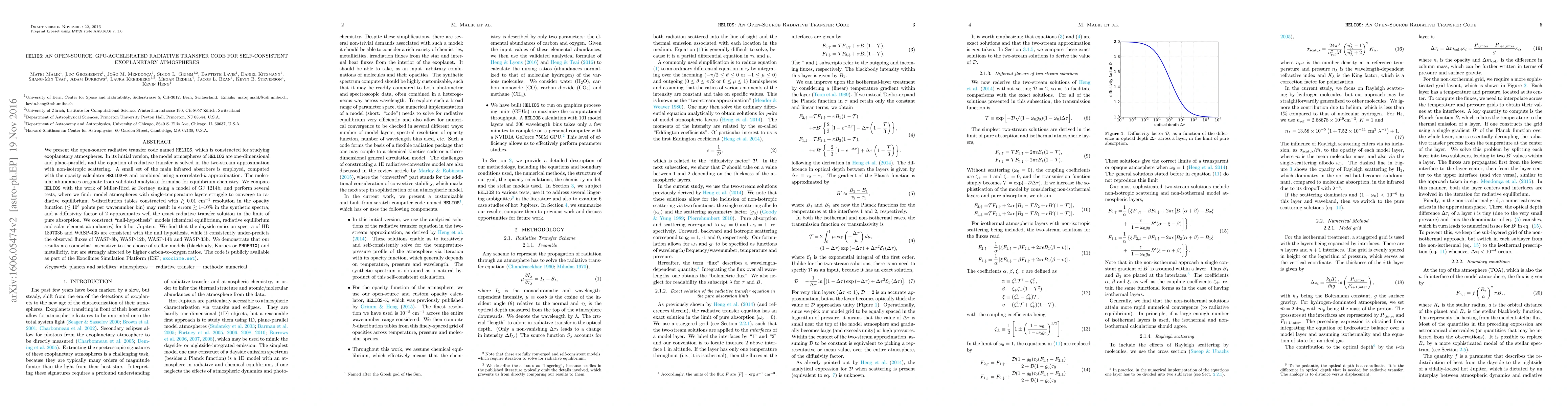 HELIOS is an open-source, GPU-accelerated radiative transfer code for studying one-dimensional exoplanetary atmospheres, employing a two-stream approximation and correlated-$k$ opacity. Tests show that it performs well for certain hot Jupiters but under-predicts the emission spectra of others, highlighting the impact of carbon-to-oxygen ratios on model accuracy.