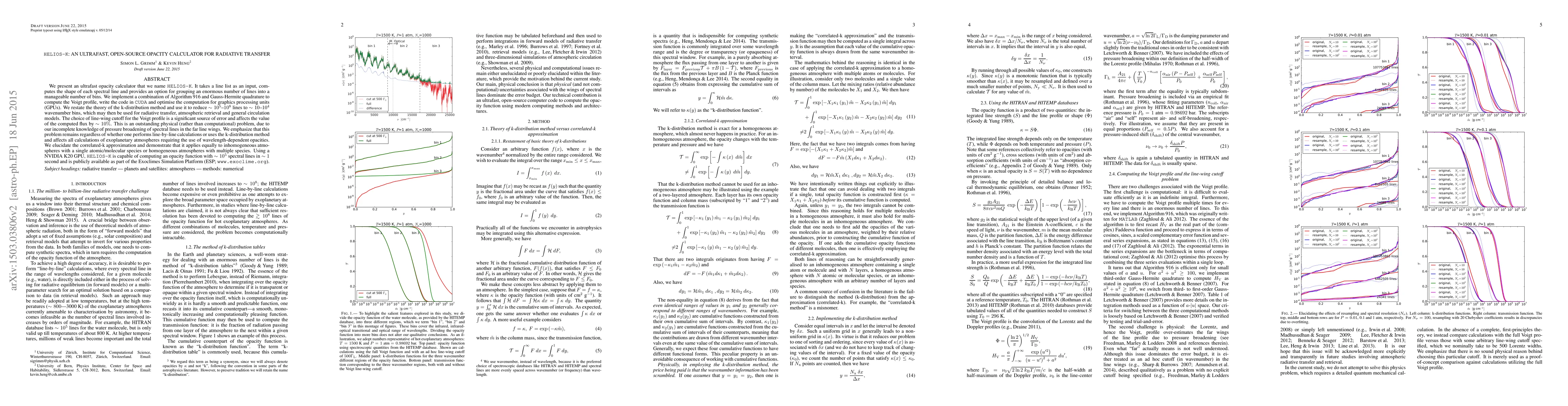 HELIOS-K is an ultrafast, open-source opacity calculator optimized for GPUs, employing the k-distribution method to reduce millions of spectral lines to manageable bins for radiative transfer. Despite its speed, it highlights the persistent physical challenge of accurately determining line-wing cutoffs for the Voigt profile.
