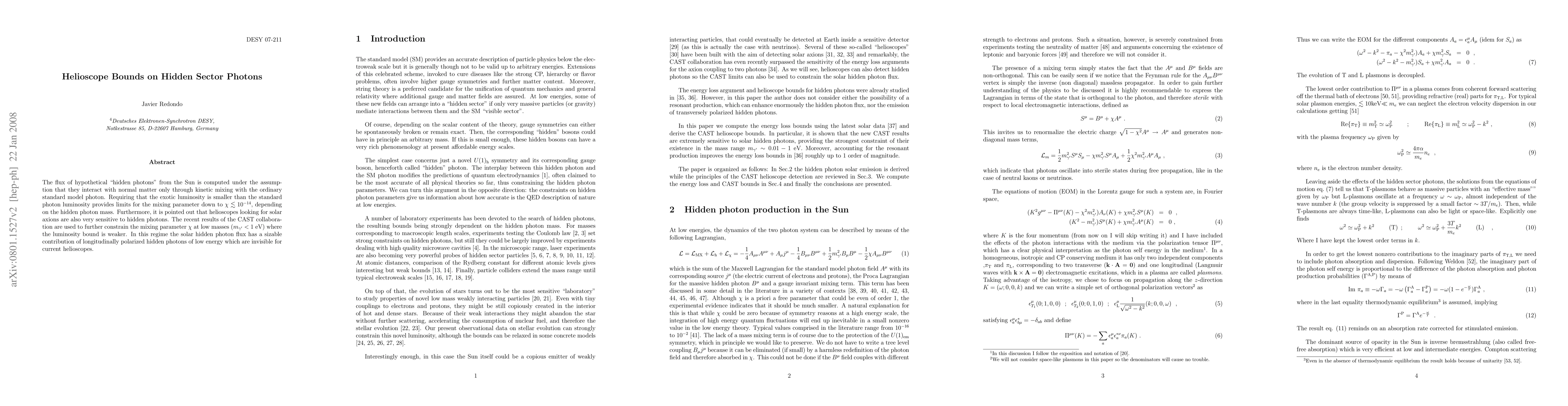 This paper establishes limits on the kinetic mixing parameter for hidden photons based on their flux from the Sun, constrained by requiring it to be less than the standard photon luminosity. The Helioscope experiment, particularly CAST, provides stringent bounds down to 10^-14, especially for hidden photon masses below 1 eV.