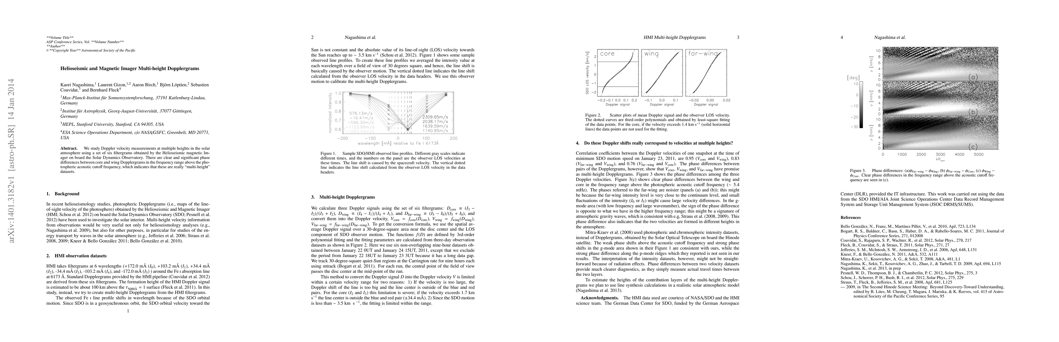 This research investigates Doppler velocity measurements at various heights in the solar atmosphere using data from the Helioseismic and Magnetic Imager. The study reveals significant phase differences between core and wing Dopplergrams above the photospheric acoustic cutoff frequency, confirming the datasets' multi-height nature.