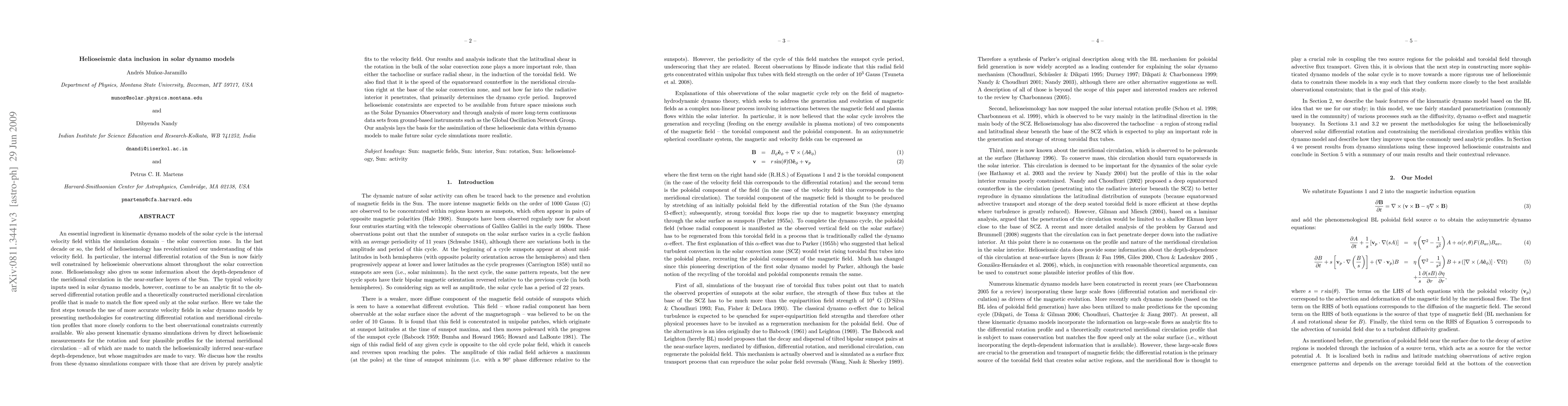 This paper introduces methods for incorporating helioseismic data into solar dynamo models, focusing on differential rotation and meridional circulation profiles. It finds that the latitudinal shear in the convection zone is crucial for toroidal field induction, while the equatorward counter-flow speed at the convection zone base determines the dynamo cycle period.