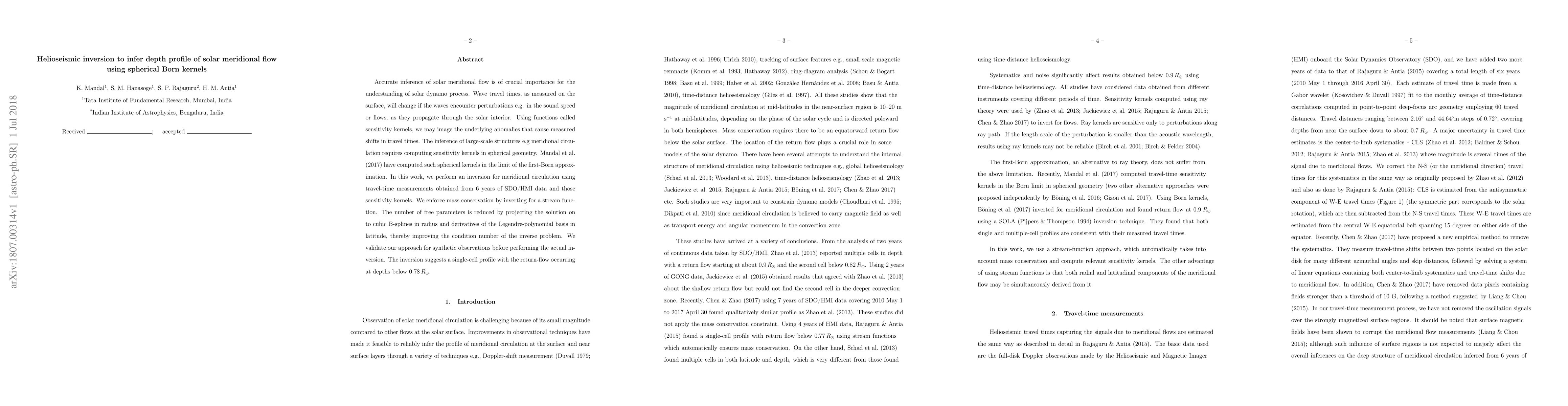 This paper presents an inversion technique using helioseismic travel-time data and spherical Born kernels to infer the depth profile of solar meridional flow. The method enforces mass conservation and reduces the number of free parameters, leading to the identification of a single-cell meridional circulation with return flow below 0.78 solar radii.
