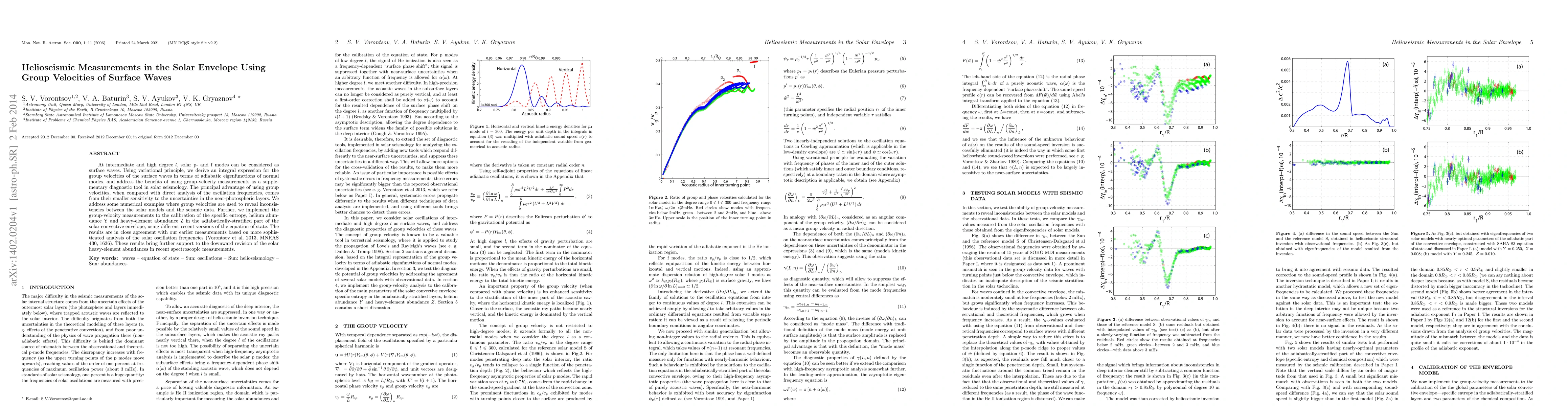 This research presents a method using group velocities of surface waves in the Sun's envelope, derived via variational principle, as a diagnostic tool in solar seismology. The technique offers reduced sensitivity to uncertainties in near-photospheric layers, enabling improved calibration of entropy, helium, and heavy-element abundances in the solar convective envelope. Results align with earlier measurements, supporting downward revisions of solar heavy-element abundances from recent spectroscopic data.