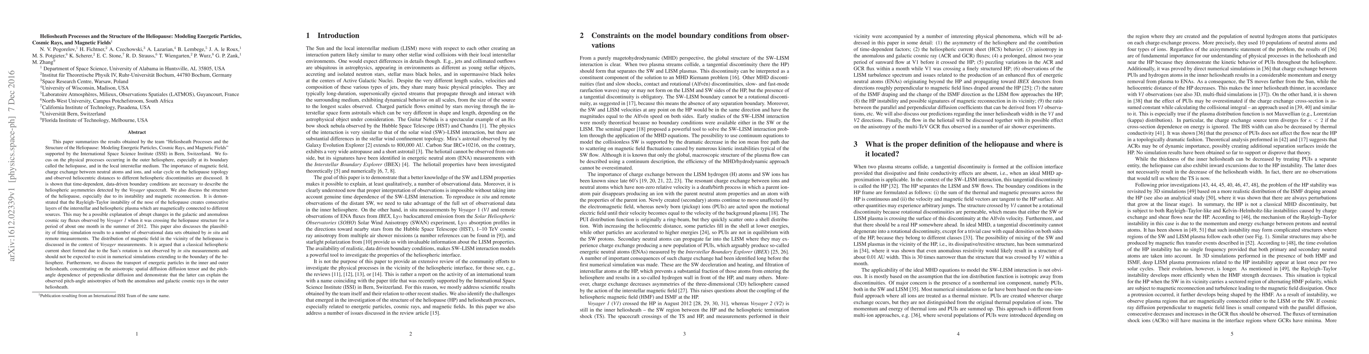 This paper summarizes the results obtained by the team "Heliosheath Processes and the Structure of the Heliopause: Modeling Energetic Particles, Cosmic Rays, and Magnetic Fields" supported by the International Space Science Institute in Bern, Switzerland. We focus on the physical processes occurring in the outer heliosphere, especially at its boundary called the heliopause (HP), and in the LISM. The importance of magnetic field, charge exchange between atoms and ions, and solar cycle on the heliopause topology and observed heliocentric distances to different heliospheric discontinuities are discussed. It is shown that time-dependent boundary conditions are necessary to describe the heliospheric asymmetries detected by the Voyager spacecraft. We also discuss the structure of the HP, especially due to its instability and magnetic reconnection. It is demonstrated that the Rayleigh-Taylor instability of the nose of the HP creates consecutive layers of the interstellar and heliospheric plasma which are magnetically connected to different sources. This may be a possible explanation of abrupt changes in the galactic and anomalous cosmic ray fluxes observed by Voyager 1 when it was crossing the HP structure for a period of about one month in the summer of 2012. This paper also discusses the plausibility of fitting simulation results to a number of observational data sets obtained by in situ and remote measurements. The distribution of magnetic field in the vicinity of the HP is discussed in the context of Voyager measurements. We discuss the transport of energetic particles in the inner and outer heliosheath, concentrating on the anisotropic spatial diffusion diffusion tensor and the pitch-angle dependence of perpendicular diffusion and demonstrate that the latter can explain the observed pitch-angle anisotropies of both the anomalous and galactic cosmic rays in the outer heliosheath.