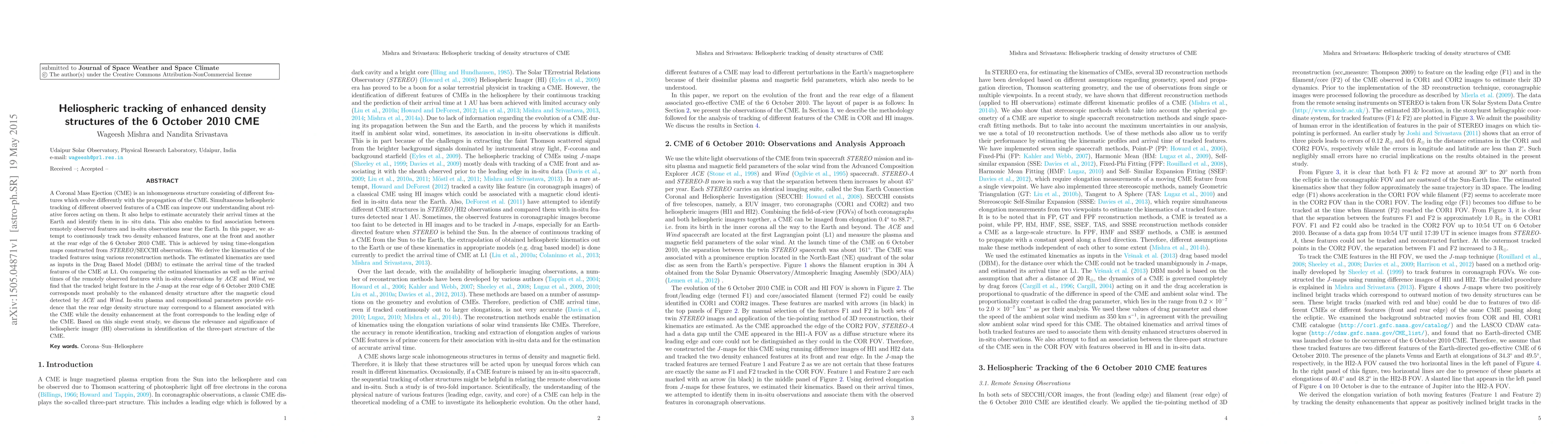 This paper tracks two density-enhanced features of the 6 October 2010 CME using STEREO/SECCHI observations, deriving their kinematics and estimating their arrival times at L1. The study finds that the rear edge density structure likely corresponds to a filament associated with the CME, while the front enhancement relates to the CME's leading edge.