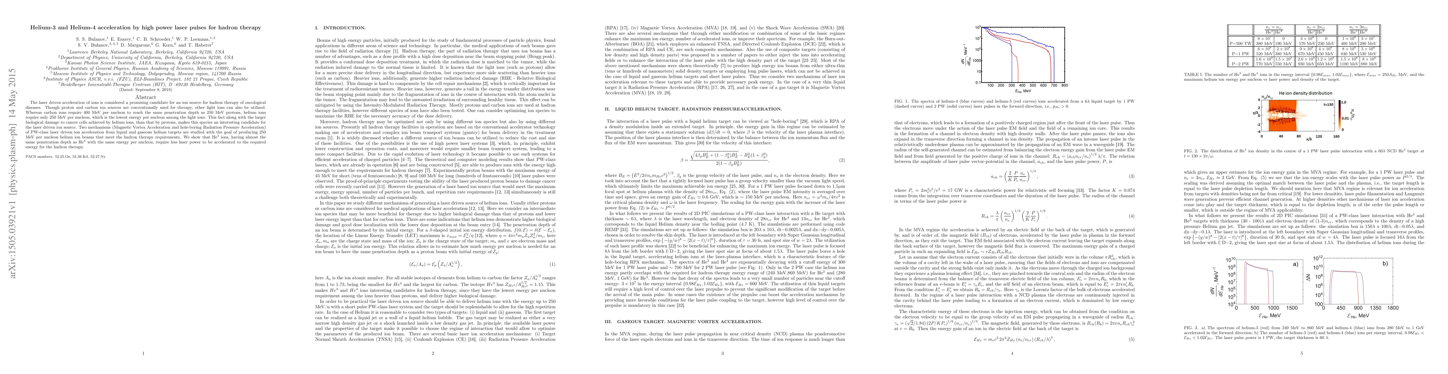 The laser driven acceleration of ions is considered a promising candidate for an ion source for hadron therapy of oncological diseases. Though proton and carbon ion sources are conventionally used for therapy, other light ions can also be utilized. Whereas carbon ions require 400 MeV per nucleon to reach the same penetration depth as 250 MeV protons, helium ions require only 250 MeV per nucleon, which is the lowest energy per nucleon among the light ions. This fact along with the larger biological damage to cancer cells achieved by helium ions, than that by protons, makes this species an interesting candidate for the laser driven ion source. Two mechanisms (Magnetic Vortex Acceleration and hole-boring Radiation Pressure Acceleration) of PW-class laser driven ion acceleration from liquid and gaseous helium targets are studied with the goal of producing 250 MeV per nucleon helium ion beams that meet the hadron therapy requirements. We show that He3 ions, having almost the same penetration depth as He4 with the same energy per nucleon, require less laser power to be accelerated to the required energy for the hadron therapy.