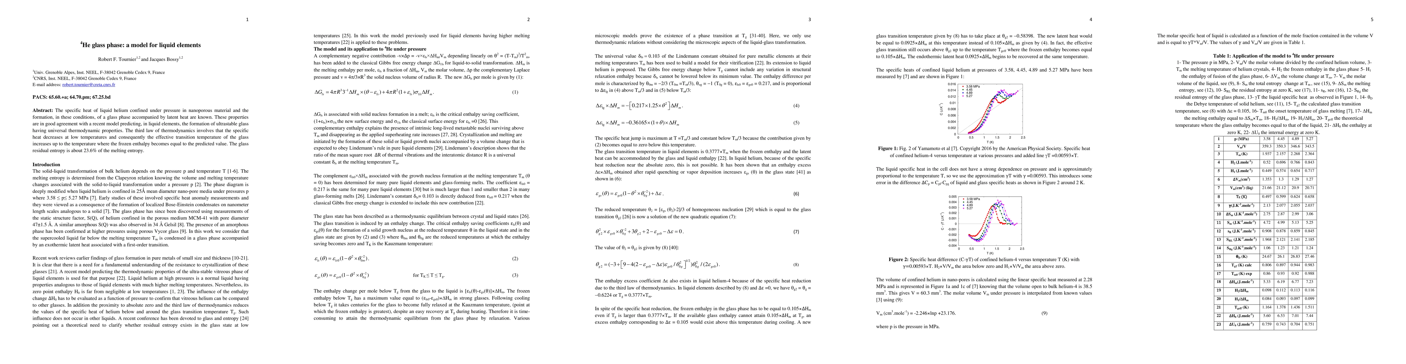 This paper explores the formation of a glass phase in liquid helium-4 under pressure, showing agreement with a model predicting universal thermodynamic properties in liquid elements. The study finds that the specific heat decreases at low temperatures, leading to an increased effective transition temperature for the glass phase.