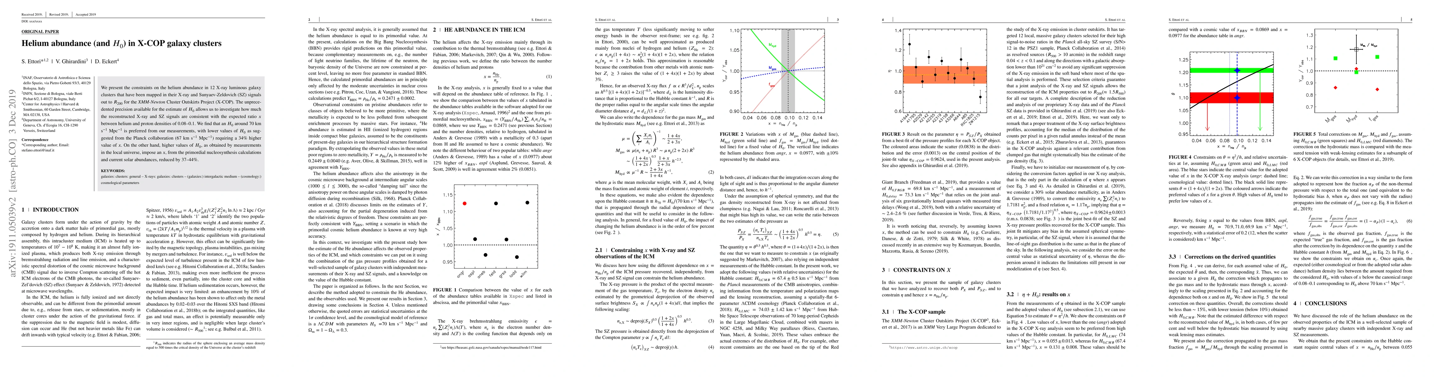We present the constraints on the helium abundance in 12 X-ray luminous galaxy clusters that have been mapped in their X-ray and Sunyaev-Zeldovich (SZ) signals out to $R_{200}$ for the XMM-Newton Cluster Outskirts Project (X-COP). The unprecedented precision available for the estimate of $H_0$ allows us to investigate how much the reconstructed X-ray and SZ signals are consistent with the expected ratio $x$ between helium and proton densities of 0.08-0.1. We find that a $H_0$ around 70 km/s/Mpc is preferred from our measurements, with lower values of $H_0$ as requested from the Planck collaboration (67 km/s/Mpc) requiring a 34% higher value of $x$. On the other hand, higher values of $H_0$, as obtained by measurements in the local universe, impose $x$, from the primordial nucleosynthesis calculations and current solar abundances, reduced by 37--44\%.
