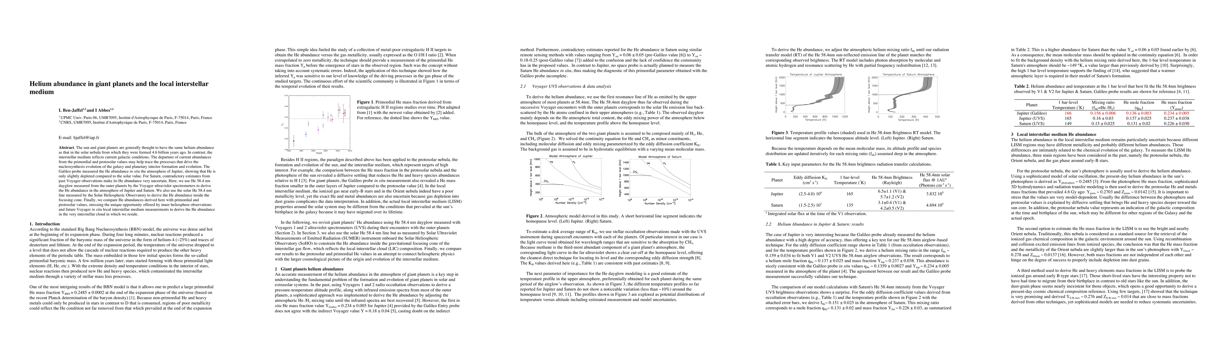 This paper investigates helium abundances in Jupiter and Saturn's atmospheres and compares them to primordial and protosolar values, using data from Voyager and Solar Heliospheric Observatory. It highlights the slight depletion of helium in Jupiter compared to the Sun and the uncertainty in Saturn's helium abundance, emphasizing the importance of these measurements for understanding galactic nucleosynthesis and planetary evolution.