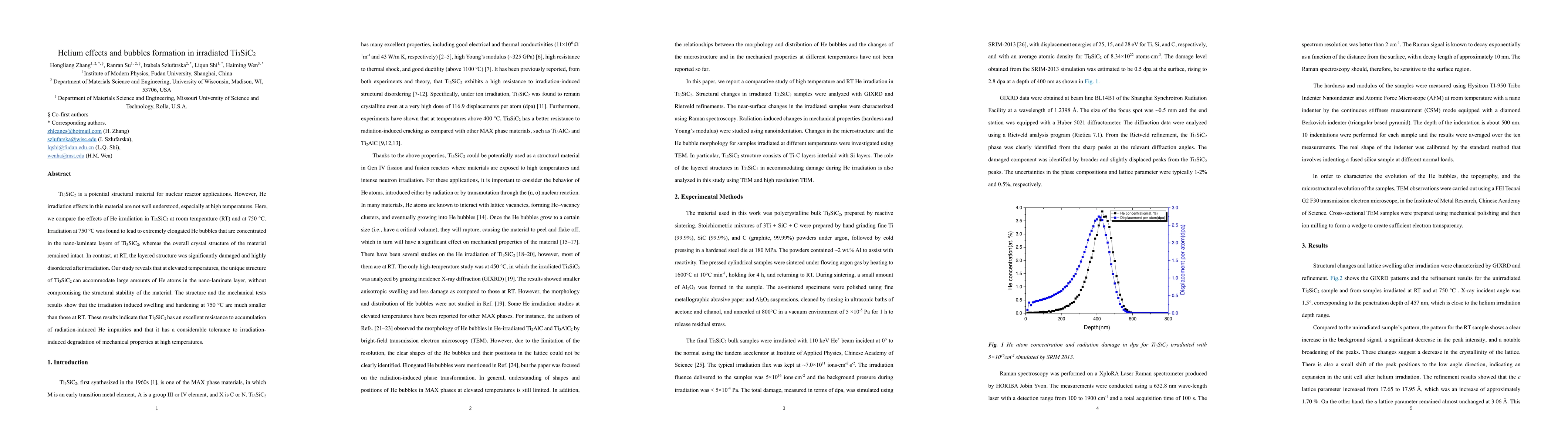 This study investigates helium irradiation effects on Ti3SiC2 at different temperatures, finding that elevated temperatures (750°C) lead to elongated He bubbles in the nano-laminate layers without structural damage, while room temperature irradiation causes significant structural damage. Ti3SiC2 shows excellent resistance to He accumulation and maintains mechanical stability at high temperatures.