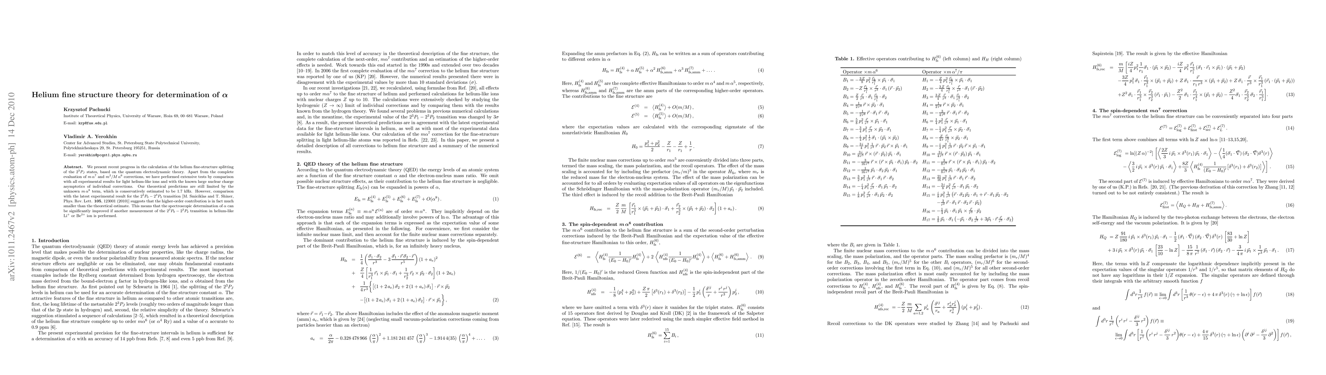 We present recent progress in the calculation of the helium fine-structure splitting of the 2^3P_J states, based on the quantum electrodynamic theory. Apart from the complete evaluation of m\alpha^7 and m^2/M\alpha^6 corrections, we have performed extensive tests by comparison with all experimental results for light helium-like ions and with the known large nuclear charge asymptotics of individual corrections. Our theoretical predictions are still limited by the unknown m\alpha^8 term, which is conservatively estimated to be 1.7 kHz. However, comparison with the latest experimental result for the 2^3P_0 - 2^3P_2 transition [M. Smiciklas and T. Shiner, Phys. Rev. Lett. 105, 123001 (2010)] suggests that the higher-order contribution is in fact much smaller than the theoretical estimate. This means that the spectroscopic determination of \alpha can be significantly improved if another measurement of the 2^3P_0 - 2^3P_2 transition in helium-like Li^+ or Be^{2+} ion is performed.
