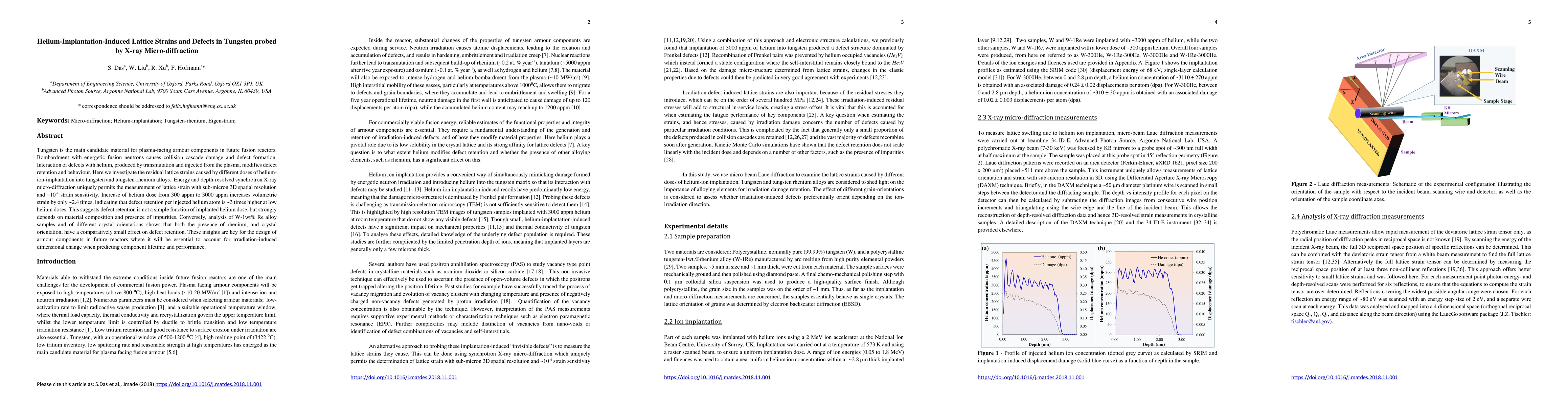 This study investigates the lattice strains and defects in tungsten and tungsten-rhenium alloys induced by helium-ion implantation, using synchrotron X-ray micro-diffraction. It finds that low helium doses lead to significantly higher defect retention, suggesting a complex relationship between helium dose and defect behaviour influenced by material composition.