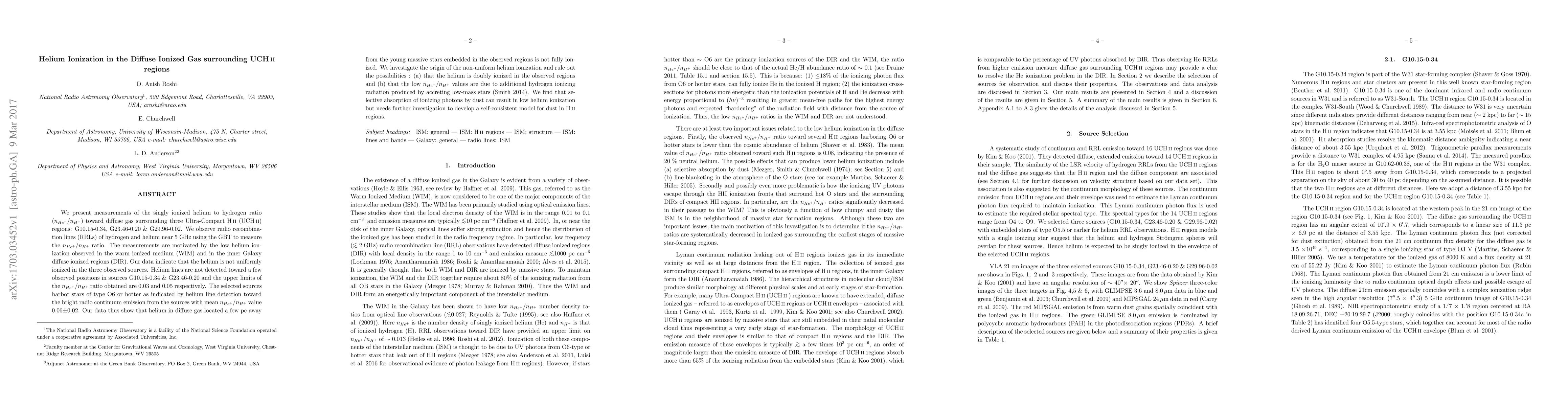We present measurements of the singly ionized helium to hydrogen ratio ($n_{He^+}/n_{H^+}$) toward diffuse gas surrounding three Ultra-Compact HII (UCHII ) regions: G10.15-0.34, G23.46-0.20 \& G29.96-0.02. We observe radio recombination lines (RRLs) of hydrogen and helium near 5 GHz using the GBT to measure the $n_{He^+}/n_{H^+}$ ratio. The measurements are motivated by the low helium ionization observed in the warm ionized medium (WIM) and in the inner Galaxy diffuse ionized regions (DIR). Our data indicate that the helium is not uniformly ionized in the three observed sources. Helium lines are not detected toward a few observed positions in sources G10.15-0.34 \& G23.46-0.20 and the upper limits of the $n_{He^+}/n_{H^+}$ ratio obtained are 0.03 and 0.05 respectively. The selected sources harbor stars of type O6 or hotter as indicated by helium line detection toward the bright radio continuum emission from the sources with mean $n_{He^+}/n_{H^+}$ value 0.06$\pm$0.02. Our data thus show that helium in diffuse gas located a few pc away from the young massive stars embedded in the observed regions is not fully ionized.We investigate the origin of the non-uniform helium ionization and rule out the possibilities : (a) that the helium is doubly ionized in the observed regions and (b) that the low $n_{He^+}/n_{H^+}$ values are due to additional hydrogen ionizing radiation produced by accreting low-mass stars (Smith 2014). We find that selective absorption of ionizing photons by dust can result in low helium ionization but needs further investigation to develop a self-consistent model for dust in HII regions.