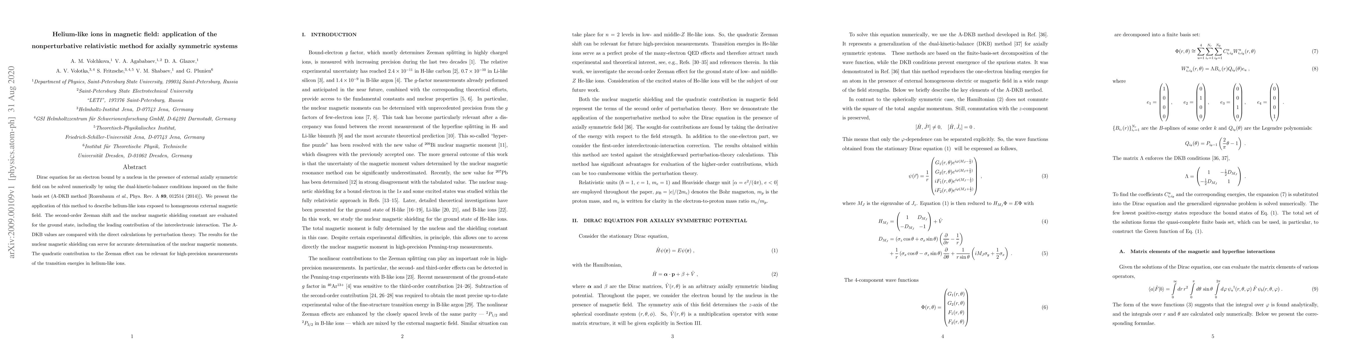 Dirac equation for an electron bound by a nucleus in the presence of external axially symmetric field can be solved numerically by using the dual-kinetic-balance conditions imposed on the finite basis set (A-DKB method [Rozenbaum et al, Phys. Rev. A 89, 012514 (2014)]). We present the application of this method to describe helium-like ions exposed to homogeneous external magnetic field. The second-order Zeeman shift and the nuclear magnetic shielding constant are evaluated for the ground state, including the leading contribution of the interelectronic interaction. The A-DKB values are compared with the direct calculations by perturbation theory. The results for the nuclear magnetic shielding can serve for accurate determination of the nuclear magnetic moments. The quadratic contribution to the Zeeman effect can be relevant for high-precision measurements of the transition energies in helium-like ions.