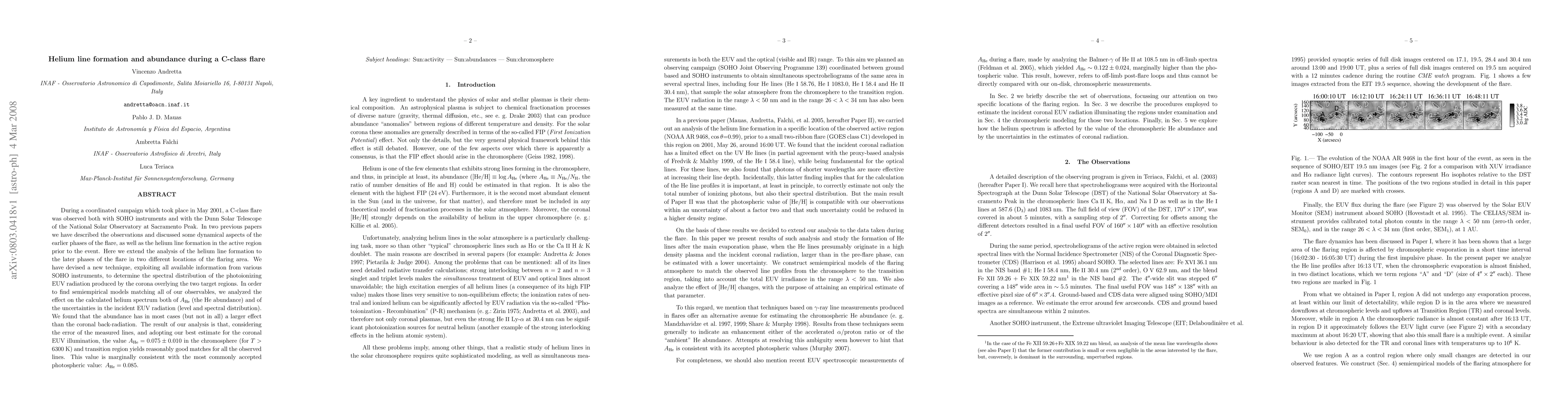 During a coordinated campaign which took place in May 2001, a C-class flare was observed both with SOHO instruments and with the Dunn Solar Telescope of the National Solar Observatory at Sacramento Peak. In two previous papers we have described the observations and discussed some dynamical aspects of the earlier phases of the flare, as well as the helium line formation in the active region prior to the event. Here we extend the analysis of the helium line formation to the later phases of the flare in two different locations of the flaring area. We have devised a new technique, exploiting all available information from various SOHO instruments, to determine the spectral distribution of the photoionizing EUV radiation produced by the corona overlying the two target regions. In order to find semiempirical models matching all of our observables, we analyzed the effect on the calculated helium spectrum both of A(He) (the He abundance) and of the uncertainties in the incident EUV radiation (level and spectral distribution). We found that the abundance has in most cases (but not in all) a larger effect than the coronal back-radiation. The result of our analysis is that, considering the error of the measured lines, and adopting our best estimate for the coronal EUV illumination, the value A(He)=0.075 +/- 0.010 in the chromosphere (for T>6300 K) and transition region yields reasonably good matches for all the observed lines. This value is marginally consistent with the most commonly accepted photospheric value: A(He)=0.085.
