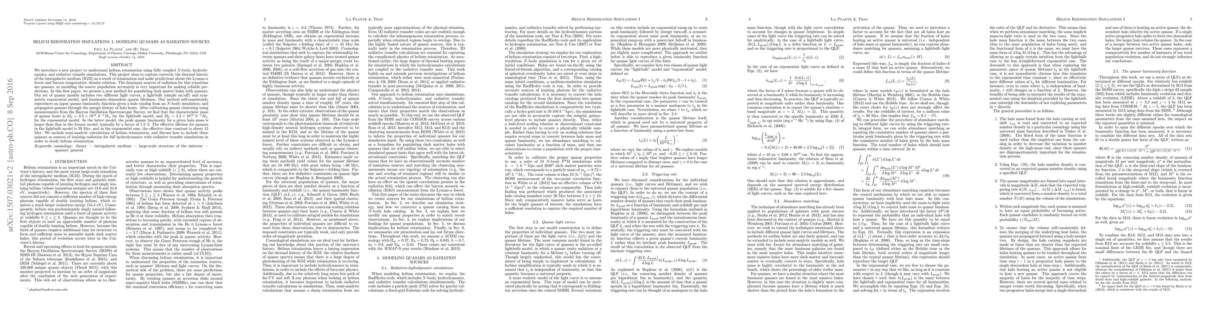 This paper introduces a new simulation project to model helium reionization, focusing on quasars as radiation sources. It presents a method to populate dark matter halos with quasars, including different light curves and luminosity-dependent lifetimes, and calibrates quasar clustering to match observations.