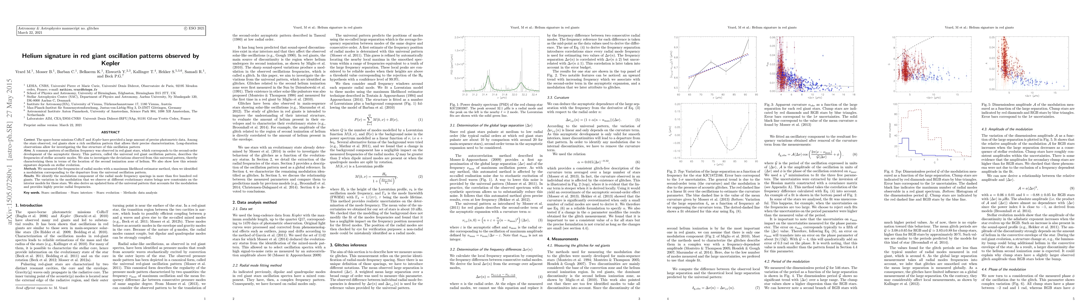This study investigates deviations in the oscillation patterns of red giant stars observed by Kepler, identifying a modulation linked to the second ionization zone of helium. The findings refine the universal red giant oscillation pattern and provide new insights into stellar evolution and interior models.