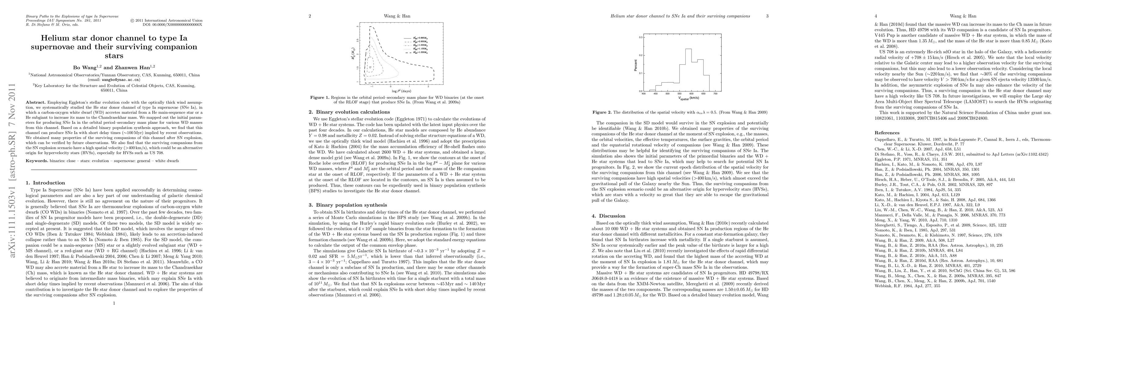 Employing Eggleton's stellar evolution code with the optically thick wind assumption, we systematically studied the He star donor channel of type Ia supernovae (SNe Ia), in which a carbon-oxygen white dwarf (WD) accretes material from a He main-sequence star or a He subgiant to increase its mass to the Chandrasekhar mass. We mapped out the initial parameters for producing SNe Ia in the orbital period--secondary mass plane for various WD masses from this channel. Based on a detailed binary population synthesis approach, we find that this channel can produce SNe Ia with short delay times (\sim100Myr) implied by recent observations. We obtained many properties of the surviving companions of this channel after SN explosion, which can be verified by future observations. We also find that the surviving companions from the SN explosion scenario have a high spatial velocity (>400km/s), which could be an alternative origin for hypervelocity stars (HVSs), especially for HVSs such as US 708.