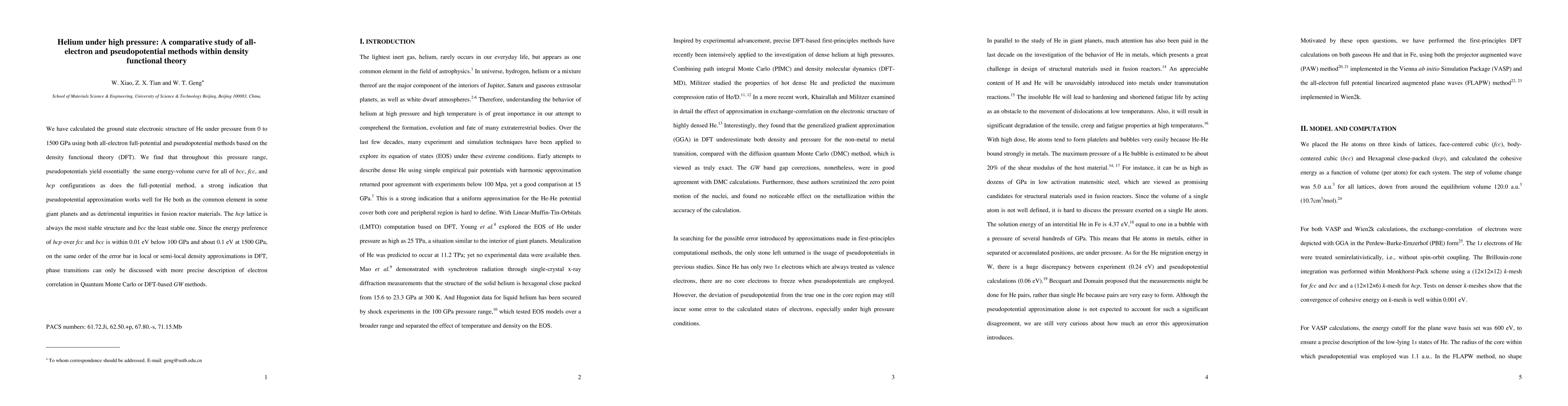 This study compares all-electron and pseudopotential methods for calculating the ground state electronic structure of helium under high pressures, finding that both methods yield similar energy-volume curves for different crystal structures. The hcp lattice is consistently the most stable, suggesting the need for more precise methods to predict phase transitions.