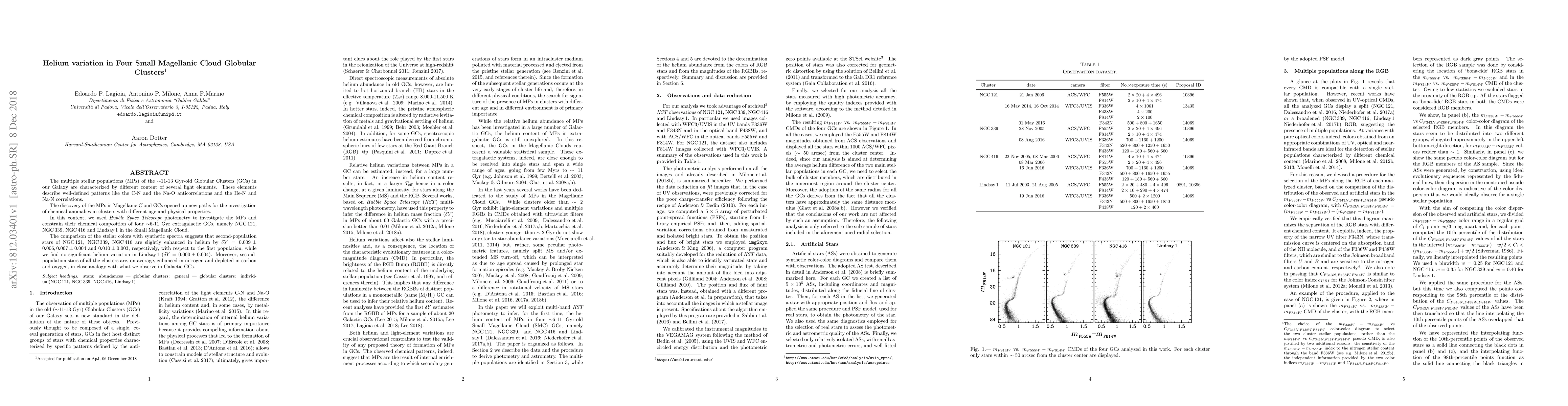 The multiple stellar populations (MPs) of $\sim$11-13 Gyr-old Globular Clusters (GCs) in our Galaxy are characterized by different content of several light elements. These elements describe well-defined patterns like the C-N and the Na-O anticorrelations and the He-N and Na-N correlations. The discovery of the MPs in Magellanic Cloud GCs opened up new paths for the investigation of chemical anomalies in clusters with different age and physical properties. In this context, we used Hubble Space Telescope photometry to investigate the MPs and constrain their chemical composition of four $\sim$6-11 Gyr extragalactic GCs, namely NGC 121,NGC 339, NGC 416 and Lindsay 1 in the Small Magellanic Cloud. The comparison of the stellar colors with synthetic spectra suggests that second-population stars of NGC 121, NGC 339, NGC 416 are slightly enhanced in helium by $\delta$Y = 0.009$\pm$0.006, 0.007$\pm$0.004 and 0.010$\pm$0.003, respectively, with respect to the first population, while we find no significant helium variation in Lindsay 1 ($\delta$Y = 0.000$\pm$0.004). Moreover, second-population stars of all the clusters are, on average, enhanced in nitrogen and depleted in carbon and oxygen, in close analogy with what we observe in Galactic GCs.