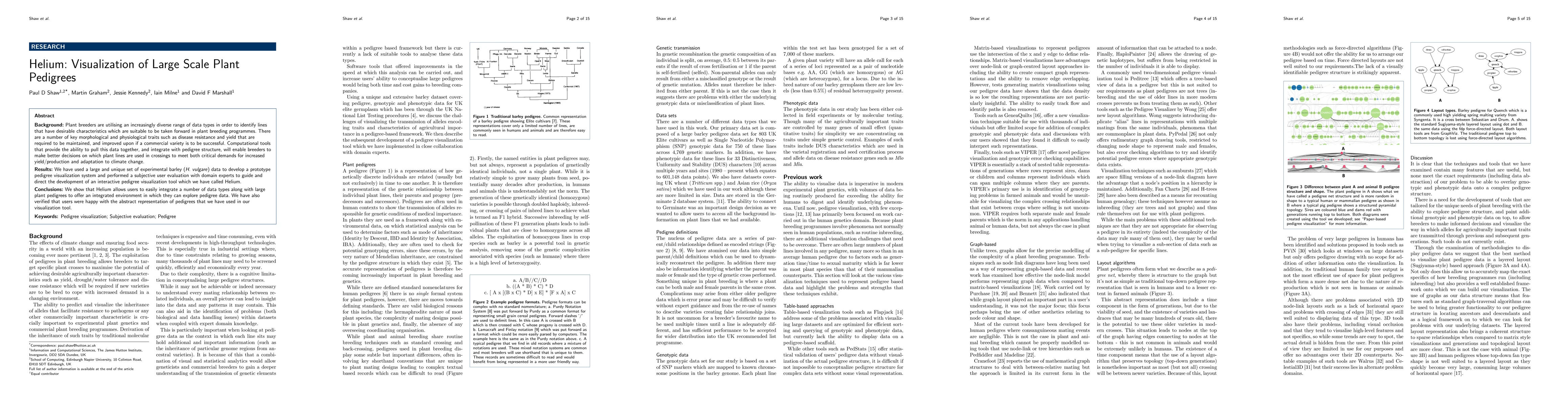 Background: Plant breeders are utilising an increasingly diverse range of data types in order to identify lines that have desirable characteristics which are suitable to be taken forward in plant breeding programmes. There are a number of key morphological and physiological traits such as disease resistance and yield that are required to be maintained, and improved upon if a commercial variety is to be successful. Computational tools that provide the ability to pull this data together, and integrate with pedigree structure, will enable breeders to make better decisions on which plant lines are used in crossings to meet both critical demands for increased yield/production and adaptation to climate change. Results: We have used a large and unique set of experimental barley (H. vulgare) data to develop a prototype pedigree visualization system and performed a subjective user evaluation with domain experts to guide and direct the development of an interactive pedigree visualization tool which we have called Helium. Conclusions: We show that Helium allows users to easily integrate a number of data types along with large plant pedigrees to offer an integrated environment in which they can explore pedigree data. We have also verified that users were happy with the abstract representation of pedigrees that we have used in our visualization tool.
