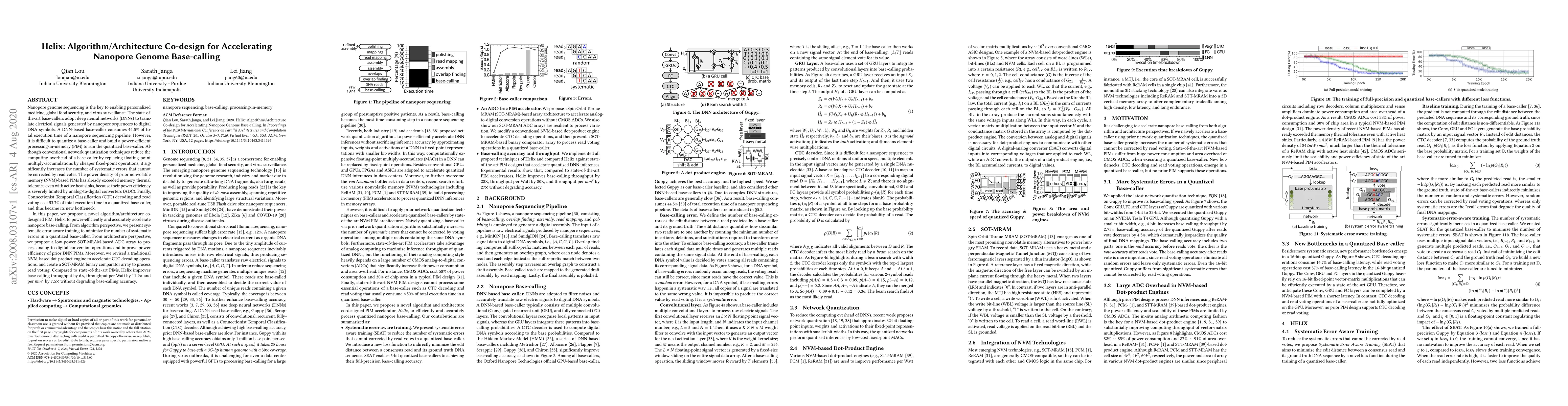 This paper introduces Helix, an algorithm/architecture co-designed processing-in-memory (PIM) system to accelerate nanopore base-calling, achieving significant improvements in throughput and power efficiency. Helix employs systematic error-aware training and a low-power SOT-MRAM-based ADC array, enhancing both accuracy and efficiency compared to traditional DNN-based PIMs.